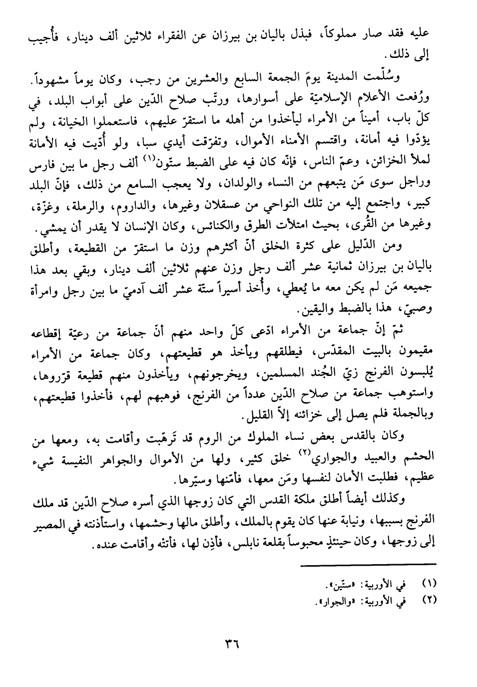 ثُمَّ إِنَّ جَمَاعَةً مِنَ الْأُمَرَاءِ ادَّعَى كُلُّ وَاحِدٍ مِنْهُمْ أَنَّ جَمَاعَةً مِنْ رَعِيَّةِ إِقْطَاعِهِ مُقِيمُونَ بِالْبَيْتِ الْمُقَدَّسِ، فَيُطْلِقُهُمْ وَيَأْخُذُ هُوَ قَطِيعَتَهُمْ، وَكَانَ جَمَاعَةٌ مِنَ الْأُمَرَاءِ يُلْبِسُونَ الْفِرِنْجَ زِيَّ الْجُنْدِ الْمُسْلِمِينَ، وَيُخْرِجُونَهُمْ، وَيَأْخُذُونَ مِنْهُمْ قَطِيعَةً قَرَّرُوهَا، وَاسْتَوْهَبَ جَمَاعَةٌ مِنْ صَلَاحِ الدِّينِ عَدَدًا مِنَ الْفِرِنْجِ، فَوَهَبَهُمْ لَهُمْ، فَأَخَذُوا قَطِيعَتَهُمْ، وَبِالْجُمْلَةِ فَلَمْ يَصِلْ إِلَى خَزَائِنِهِ إِلَّا الْقَلِيلُ.