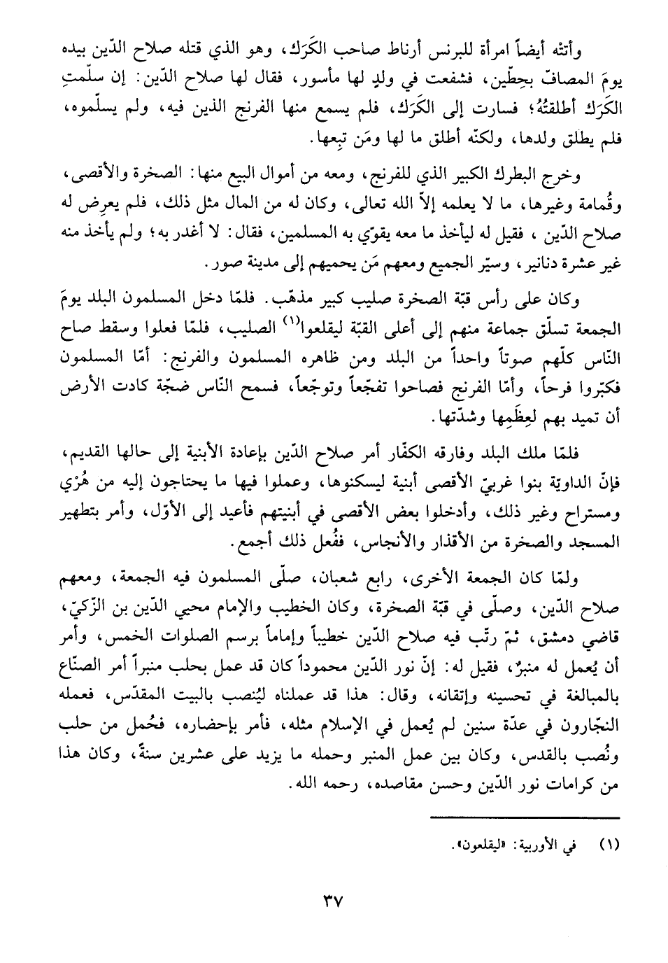 وَكَانَ عَلَى رَأْسِ قُبَّةِ الصَّخْرَةِ صَلِيبٌ كَبِيرٌ مُذَهَّبٌ، فَلَمَّا دَخَلَ الْمُسْلِمُونَ الْبَلَدَ يَوْمَ الْجُمُعَةِ تَسَلَّقَ جَمَاعَةٌ مِنْهُمْ إِلَى أَعْلَى الْقُبَّةِ لِيَقْلَعُوا الصَّلِيبَ، فَلَمَّا فَعَلُوا وَسَقَطَ صَاحَ النَّاسُ كُلُّهُمْ صَوْتًا وَاحِدًا مِنَ الْبَلَدِ وَمِنْ ظَاهِرِهِ الْمُسْلِمُونَ وَالْفِرِنْجُ: أَمَّا الْمُسْلِمُونَ فَكَبَّرُوا فَرَحًا، وَأَمَّا الْفِرِنْجُ فَصَاحُوا تَفَجُّعًا وَتَوَجُّعًا، فَسَمِعَ النَّاسُ ضَجَّةً كَادَتِ الْأَرْضُ أَنْ تَمِيدَ بِهِمْ لِعِظَمِهَا وَشِدَّتِهَا.