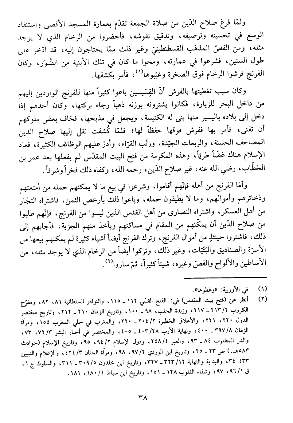 فَلَمَّا كُشِفَتْ نَقَلَ إِلَيْهَا صَلَاحُ الدِّينِ الْمَصَاحِفَ الْحَسَنَةَ، وَالرَّبَعَاتِ الْجَيِّدَةَ، وَرَتَّبَ الْقُرَّاءَ، وَأَدَرَّ عَلَيْهِمُ الْوَظَائِفَ الْكَثِيرَةَ، فَعَادَ الْإِسْلَامُ هُنَاكَ غَضًّا طَرِيًّا، وَهَذِهِ الْمَكْرُمَةُ مِنْ فَتْحِ الْبَيْتِ الْمُقَدَّسِ لَمْ يَفْعَلْهَا بَعْدَ عُمَرَ بْنِ الْخَطَّابِ، رَضِيَ اللَّهُ عَنْهُ، غَيْرُ صَلَاحِ الدِّينِ، رَحِمَهُ اللَّهُ، وَكَفَاهُ ذَلِكَ فَخْرًا وَشَرَفًا.