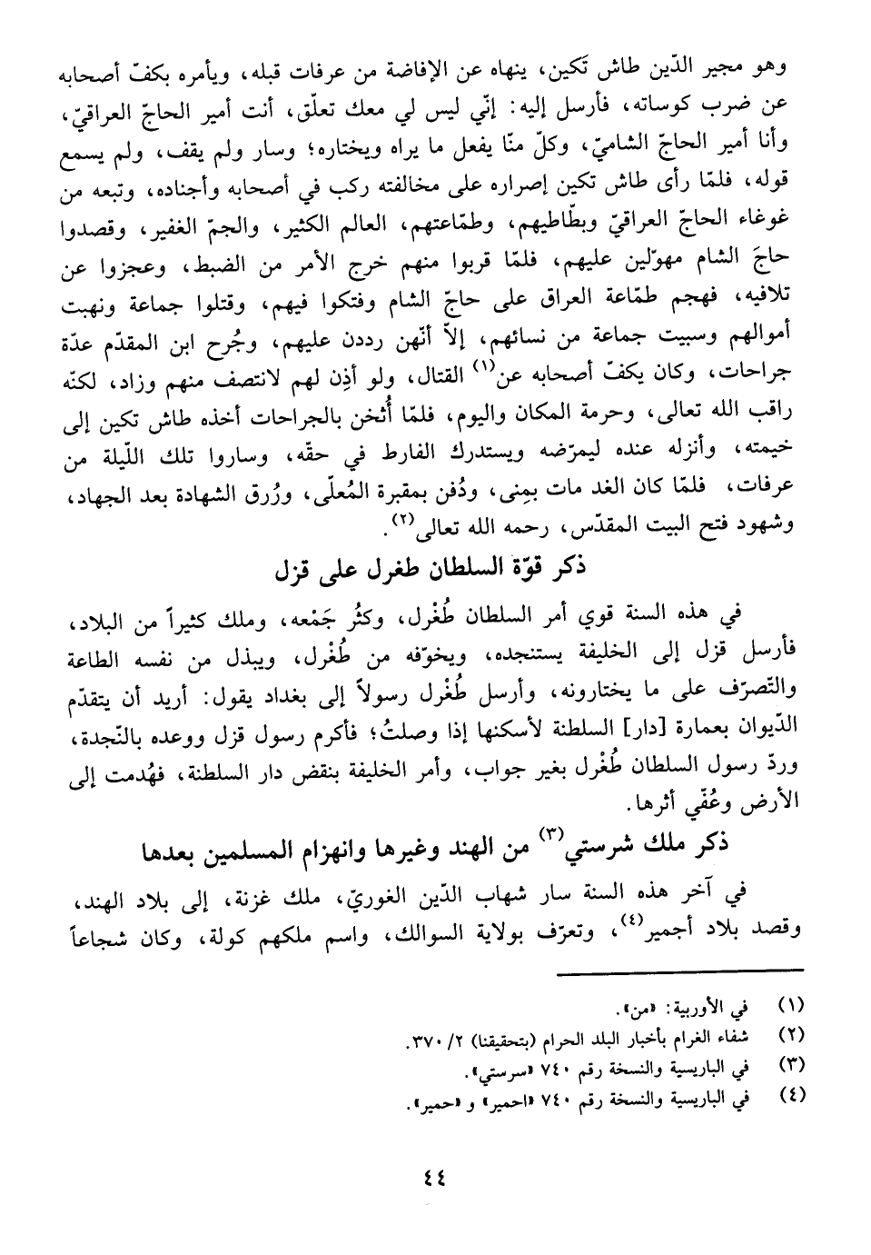 فَلَمَّا رَأَى طَاشْ تِكِينُ إِصْرَارَهُ عَلَى مُخَالَفَتِهِ رَكِبَ فِي أَصْحَابِهِ وَأَجْنَادِهِ، وَتَبِعَهُ مِنْ غَوْغَاءِ الْحَاجِّ الْعِرَاقِيِّ وَبَطَّاطِيهِمْ، وَطَمَّاعَتِهِمُ، الْعَالَمُ الْكَثِيرُ، وَالْجَمُّ الْغَفِيرُ، وَقَصَدُوا حَاجَّ الشَّامِ مُهَوِّلِينَ عَلَيْهِمْ.
