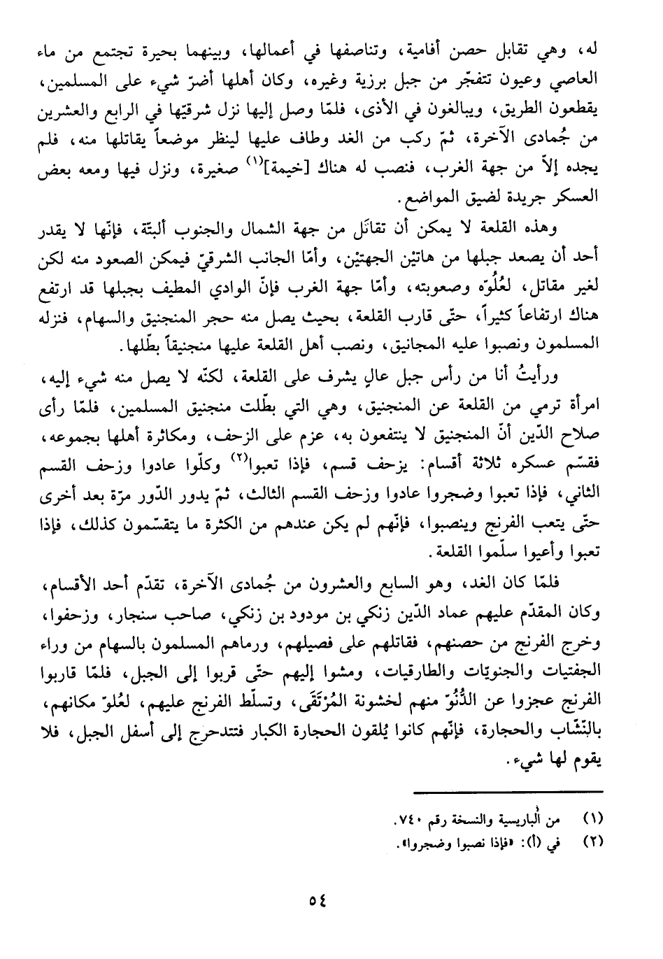 وَرَأَيْتُ أَنَا مِنْ رَأْسِ جَبَلٍ عَالٍ يُشْرِفُ عَلَى الْقَلْعَةِ، لَكِنَّهُ لَا يَصِلُ مِنْهُ شَيْءٌ إِلَيْهَا، امْرَأَةً تَرْمِي مِنَ الْقَلْعَةِ عَنِ الْمَنْجَنِيقِ، وَهِيَ الَّتِي بَطَّلَتْ مَنْجَنِيقَ الْمُسْلِمِينَ، فَلَمَّا رَأَى صَلَاحُ الدِّينِ أَنَّ الْمَنْجَنِيقَ لَا يَنْتَفِعُونَ بِهِ، عَزَمَ عَلَى الزَّحْفِ، وَمُكَاثَرَةِ أَهْلِهَا بِجُمُوعِهِ.