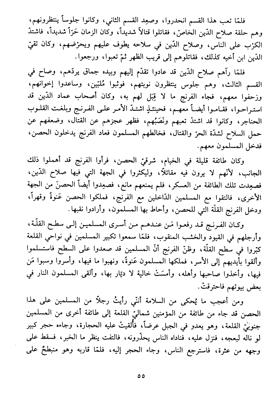 فَلَمَّا رَآهُمْ صَلَاحُ الدِّينِ قَدْ عَادُوا تَقَدَّمَ إِلَيْهِمْ وَبِيَدِهِ جُمَاقٌ يَرُدُّهُمْ، وَصَاحَ فِي الْقِسْمِ الثَّالِثِ، وَهُمْ جُلُوسٌ يَنْتَظِرُونَ نَوْبَتَهُمْ، فَوَثَبُوا مُلَبِّينَ، وَسَاعَدُوا إِخْوَانَهُمْ وَزَحَفُوا مَعَهُمْ، فَجَاءَ الْفِرِنْجَ مَا لَا قِبَلَ لَهُمْ بِهِ.