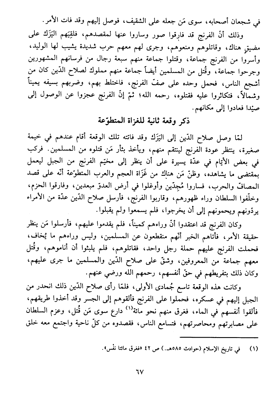 وَكَانَ الْفِرِنْجُ قَدِ اعْتَقَدُوا أَنَّ وَرَاءَهُمْ كَمِينًا، فَلَمْ يُقَدِمُوا عَلَيْهِمْ، فَأَرْسَلُوا مَنْ يَنْظُرُ فِي حَقِيقَةِ الْأَمْرِ، فَأَتَاهُمُ الْخَبَرُ أَنَّهُمْ مُنْقَطِعُونَ عَنِ الْمُسْلِمِينَ، وَلَيْسَ وَرَاءَهُمْ مَنْ يُخَافُ، فَحَمَلَتِ الْفِرِنْجُ عَلَيْهِمْ حَمْلَةَ رَجُلٍ وَاحِدٍ فَقَاتَلُوهُمْ فَلَمْ يَلْبَثُوا أَنْ أَنَامُوهُمْ، وَقُتِلَ مَعَهُمْ جَمَاعَةٌ مِنَ الْمَعْرُوفَيْنِ وَشَقَّ عَلَى صَلَاحِ الدِّينِ وَالْمُسْلِمِينَ مَا جَرَى عَلَيْهِمْ وَكَانَ ذَلِكَ بِتَفْرِيطِهِمْ فِي حَقِّ أَنْفُسِهِمْ، رَحِمَهُمُ اللَّهُ وَرَضِيَ عَنْهُمْ.