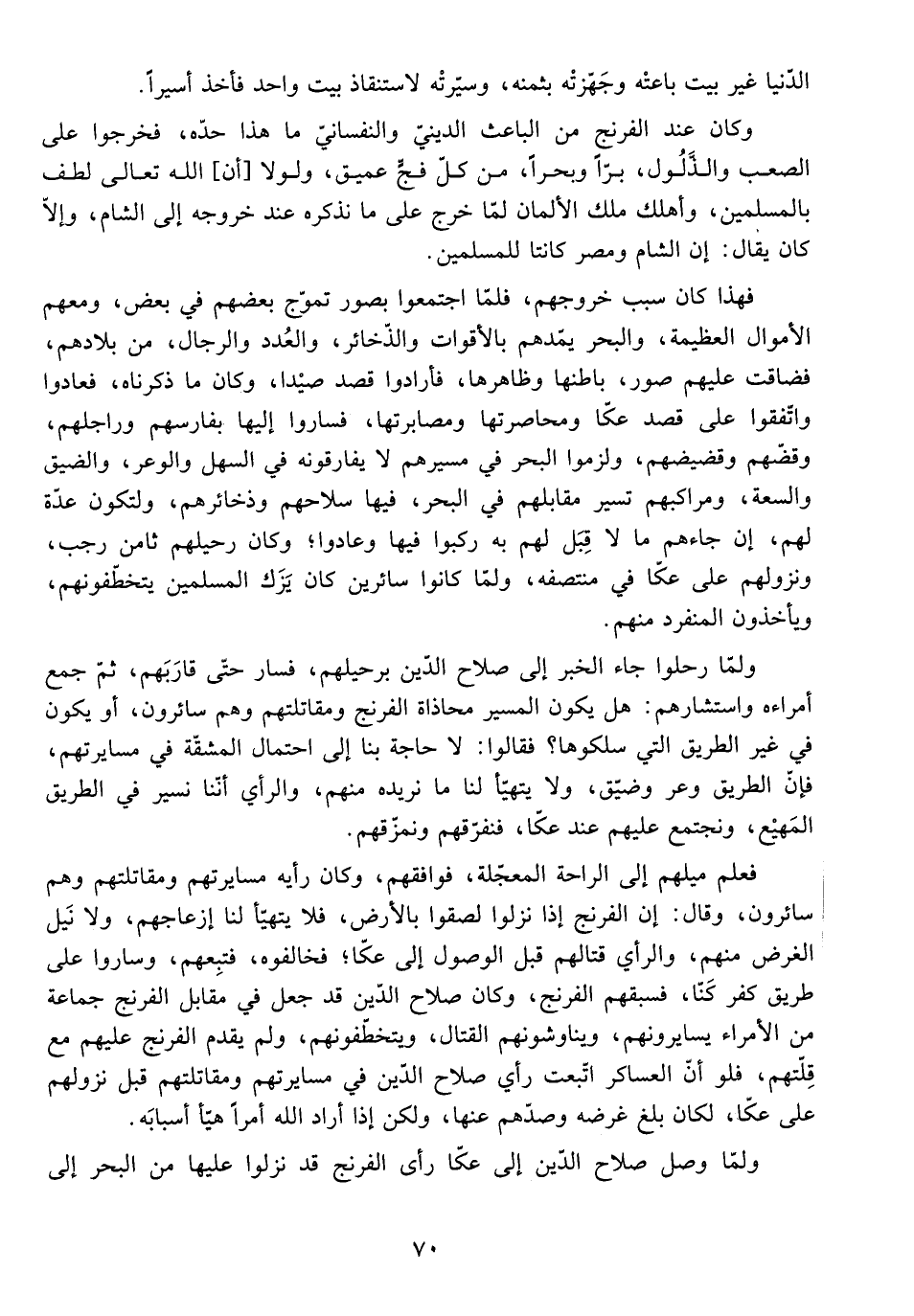 وَكَانَ صَلَاحُ الدِّينِ قَدْ جَعَلَ فِي مُقَابِلِ الْفِرِنْجِ جَمَاعَةً مِنَ الْأُمَرَاءِ يُسَايِرُونَهُمْ، وَيُنَاوِشُونَهُمُ الْقِتَالَ، وَيَتَخَطَّفُونَهُمْ، وَلَمْ يَقْدَمِ الْفِرِنْجُ عَلَيْهِمْ مَعَ قِلَّتِهِمْ، فَلَوْ أَنَّ الْعَسَاكِرَ اتَّبَعَتْ رَأْيَ صَلَاحِ الدِّينِ فِي مُسَايَرَتِهِمْ وَمُقَاتَلَتِهِمْ قَبْلَ نُزُولِهِمْ عَلَى عَكَّا لَكَانَ بَلَغَ غَرَضَهُ وَصَدَّهُمْ عَنْهَا، وَلَكِنْ إِذَا أَرَادَ اللَّهُ أَمْرًا هَيَّأَ أَسْبَابَهُ.