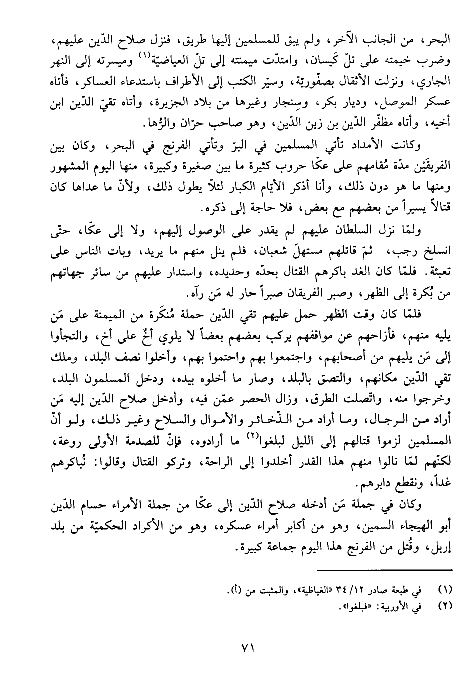 وَكَانَتِ الْأَمْدَادُ تَأْتِي الْمُسْلِمِينَ فِي الْبَرِّ وَتَأْتِي الْفِرِنْجَ فِي الْبَحْرِ، وَكَانَ بَيْنَ الْفَرِيقَيْنِ مُدَّةُ مَقَامِهِمْ عَلَى عَكَّا حُرُوبٌ كَثِيرَةٌ مَا بَيْنَ صَغِيرَةٍ وَكَبِيرَةٍ، مِنْهَا الْيَوْمُ الْمَشْهُورُ، وَمِنْهَا مَا هُوَ دُونَ ذَلِكَ، وَأَنَا أَذْكُرُ الْأَيَّامَ الْكِبَارَ لِئَلَّا يَطُولَ ذَلِكَ، وَلِأَنَّ مَا عَدَاهَا كَانَ قِتَالًا يَسِيرًا مِنْ بَعْضِهِمْ مَعَ بَعْضٍ، فَلَا حَاجَةَ إِلَى ذِكْرِهِ.