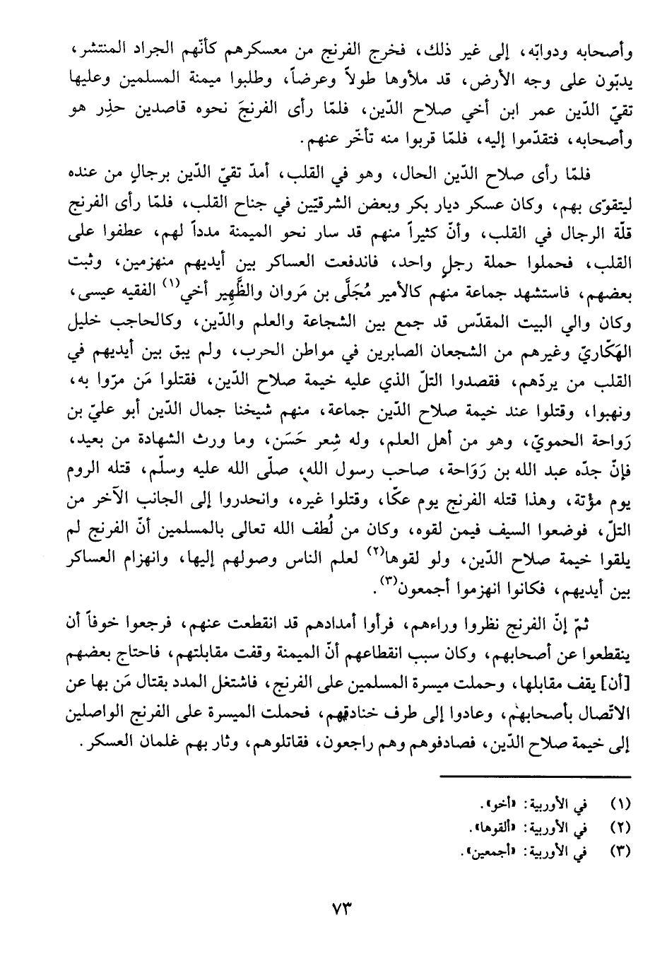 وَأَصْحَابُهُ وَدَوَابُّهُ، إِلَى غَيْرِ ذَلِكَ، فَخَرَجَ الْفِرِنْجُ مِنْ مُعَسْكَرِهِمْ كَأَنَّهُمُ الْجَرَادُ الْمُنْتَشِرُ، يَدِبُّونَ عَلَى وَجْهِ الْأَرْضِ قَدْ مَلَأُوهَا طُولًا وَعَرْضًا، وَطَلَبُوا مَيْمَنَةَ الْمُسْلِمِينَ وَعَلَيْهَا تَقِيُّ الدِّينِ عُمَرُ ابْنُ أَخِي صَلَاحِ الدِّينِ فَلَمَّا رَأَى الْفِرِنْجَ نَحْوَهُ قَاصِدِينَ حَذَرَ هُوَ وَأَصْحَابُهُ، فَتَقَدَّمُوا إِلَيْهِ، فَلَمَّا قَرُبُوا مِنْهُ تَأَخَّرَ عَنْهُمْ.