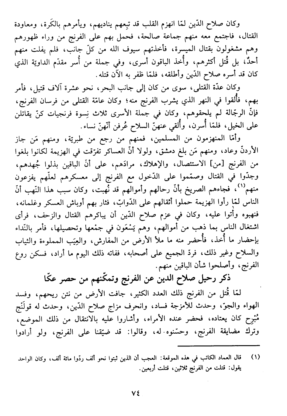 وَكَانَتْ عِدَّةُ الْقَتْلَى، سِوَى مَنْ كَانَ إِلَى جَانِبِ الْبَحْرِ، فِي عَشَرَةِ آلَافِ قَتِيلٍ، فَأَمَرَ بِهِمْ، فَأُلْقُوا فِي النَّهْرِ الَّذِي يَشْرَبُ الْفِرِنْجُ مِنْهُ وَكَانَ عَامَّةُ الْقَتْلَى مِنْ فُرْسَانِ الْفِرِنْجِ، فَإِنَّ الرَّجَّالَةَ لَمْ يَلْحَقُوهُمْ، وَكَانَ فِي جُمْلَةِ الْأَسْرَى ثَلَاثُ نِسْوَةٍ فِرِنْجِيَّاتٍ كُنَّ يُقَاتِلْنَ عَلَى الْخَيْلِ، فَلَمَّا أُسِرْنَ، وَأُلْقِي عَنْهُنَّ السِّلَاحُ عُرِفْنَ أَنَّهُنَّ نِسَاءٌ.