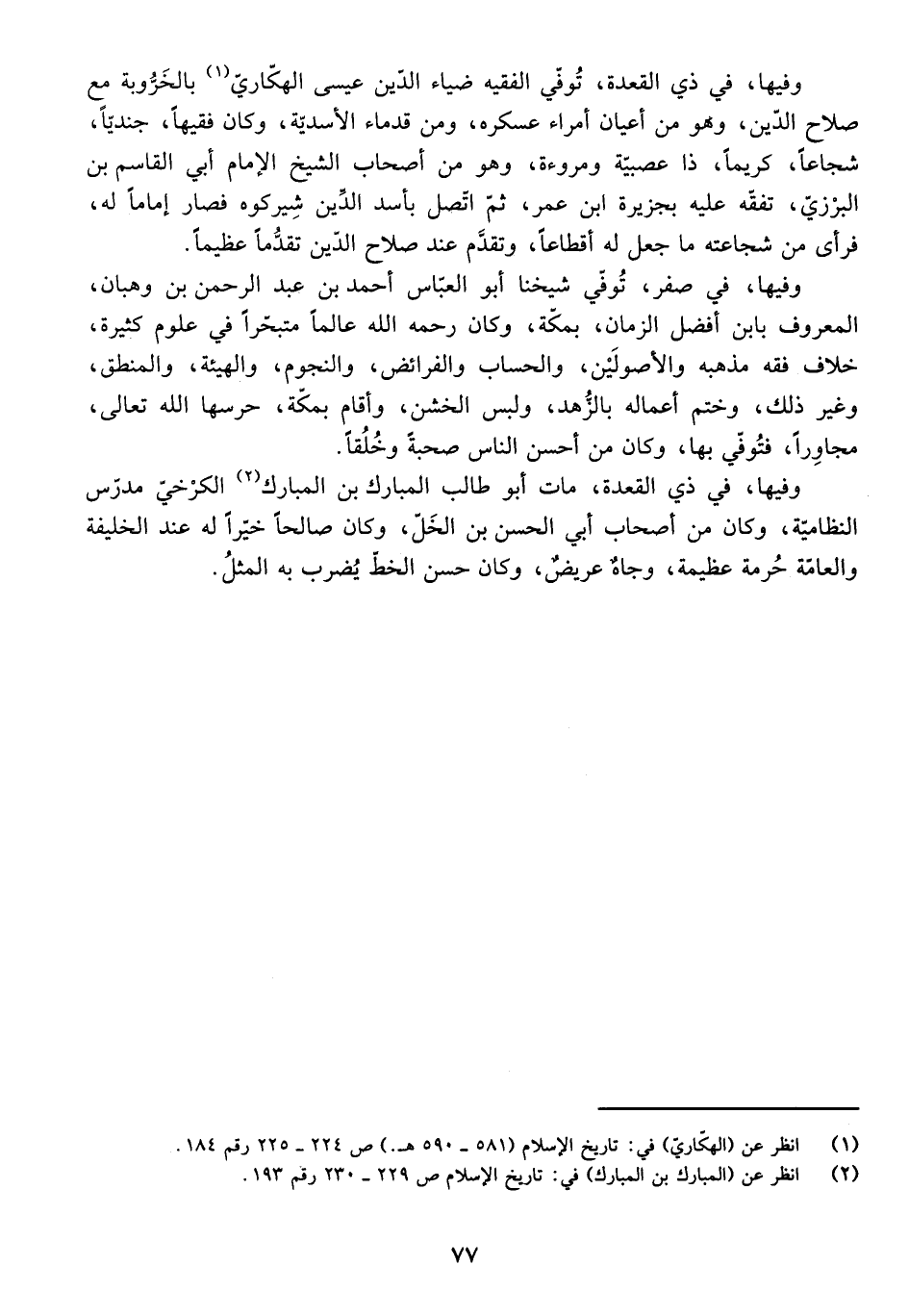 وَفِيهَا، فِي ذِي الْقِعْدَةِ، تُوُفِّيَ الْفَقِيهُ ضِيَاءُ الدِّينِ عِيسَى الْهَكَّارِيُّ بِالْخَرُّوبَةِ مَعَ صَلَاحِ الدِّينِ، وَهُوَ مِنْ أَعْيَانِ أُمَرَاءِ عَسْكَرِهِ، وَمِنْ قُدَمَاءِ الْأَسَدِيَّةِ، وَكَانَ فَقِيهًا، جُنْدِيًّا، شُجَاعًا، كَرِيمًا، ذَا عَصَبِيَّةٍ وَمُرُوءَةٍ، وَهُوَ مِنْ أَصْحَابِ الشَّيْخِ الْإِمَامِ أَبِي الْقَاسِمِ بْنِ الْبَرْزِيِّ، تَفَقَّهَ عَلَيْهِ بِجَزِيرَةِ ابْنِ عُمَرَ، ثُمَّ اتَّصَلَ بِأَسَدِ الدِّينِ شِيرَكُوهُ فَصَارَ إِمَامًا لَهُ، فَرَأَى مِنْ شَجَاعَتِهِ مَا جَعَلَ لَهُ أَقْطَاعًا، وَتَقَدَّمَ عِنْدَ صَلَاحِ الدِّينِ تَقَدُّمًا عَظِيمًا.