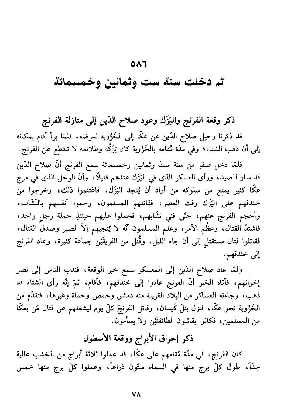 كَانَ الْفِرِنْجُ، فِي مُدَّةِ مَقَامِهِمْ عَلَى عَكَّا، قَدْ عَمِلُوا ثَلَاثَةَ أَبْرَاجٍ مِنَ الْخَشَبِ عَالِيَةٍ جِدًّا، طُولُ كُلِّ بُرْجٍ مِنْهَا فِي السَّمَاءِ سِتُّونَ ذِرَاعًا، وَعَمِلُوا كُلَّ بُرْجٍ مِنْهَا خَمْسَ طَبَقَاتٍ،