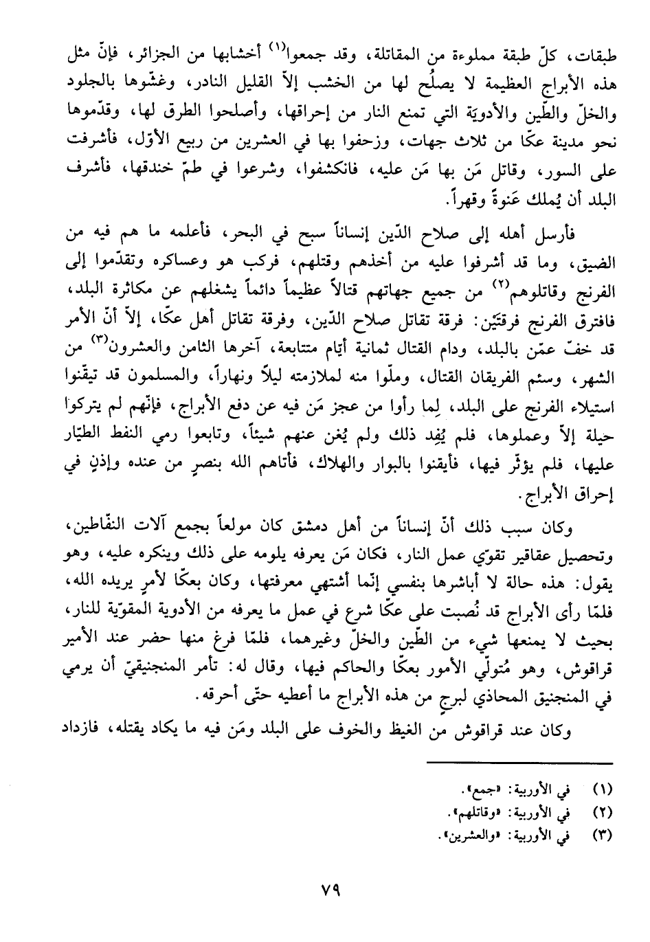 وَكَانَ سَبَبُ ذَلِكَ، أَنَّ إِنْسَانًا مِنْ أَهْلِ دِمَشْقَ كَانَ مُولَعًا بِجَمْعِ آلَاتِ النَّفَّاطِينَ، وَتَحْصِيلِ عَقَاقِيرَ تُقَوِّي عَمَلَ النَّارِ فَكَانَ مَنْ يَعْرِفُهُ يَلُومُهُ عَلَى ذَلِكَ وَيُنْكِرُهُ عَلَيْهِ وَهُوَ يَقُولُ: هَذِهِ حَالَةٌ لَا أُبَاشِرُهَا بِنَفْسِي إِنَّمَا أَشْتَهِي مَعْرِفَتَهَا، وَكَانَ بِعَكَّا لِأَمْرٍ يُرِيدُهُ اللَّهُ.