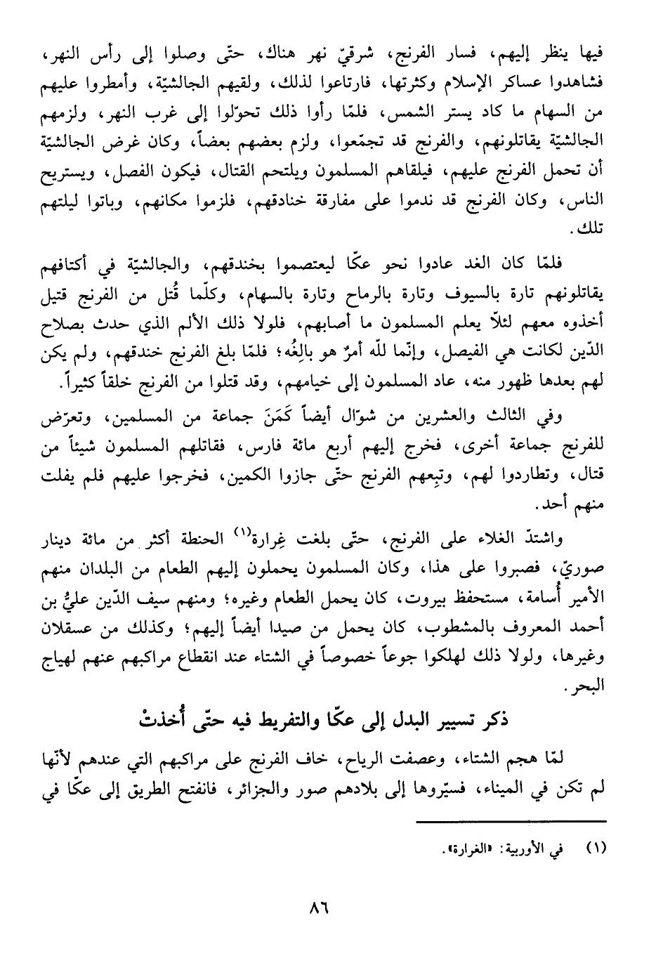 لَمَّا هَجَمَ الشِّتَاءُ، وَعَصَفَتِ الرِّيَاحُ، خَافَ الْفِرِنْجُ عَلَى مَرَاكِبِهِمُ الَّتِي عِنْدَهُمْ لِأَنَّهَا لَمْ تَكُنْ فِي الْمِينَاءِ، فَسَيَّرُوهَا إِلَى بِلَادِهِمْ صُورَ وَالْجَزَائِرِ، فَانْفَتَحَ الطَّرِيقُ إِلَى عَكَّا فِي
