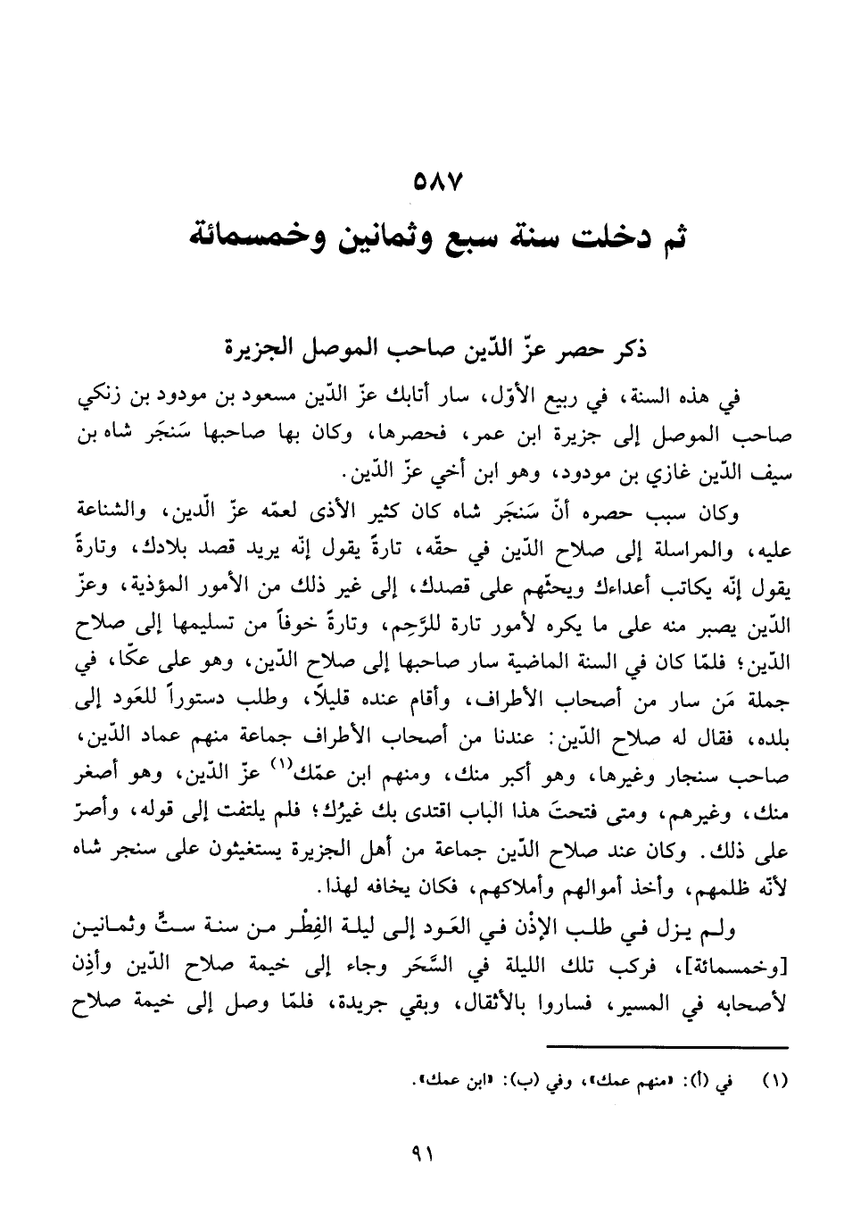 وَعِزُّ الدِّينِ يَصْبِرُ مِنْهُ عَلَى مَا يَكْرَهُ لِأُمُورٍ: تَارَةً لِلرَّحِمِ، وَتَارَةً خَوْفًا مِنْ تَسْلِيمِهَا إِلَى صَلَاحِ الدِّينِ، فَلَمَّا كَانَ فِي السَّنَةِ الْمَاضِيَةِ سَارَ صَاحِبُهَا إِلَى صَلَاحِ الدِّينِ، وَهُوَ عَلَى عَكَّا، فِي جُمْلَةِ مَنْ سَارَ مِنْ أَصْحَابِ الْأَطْرَافِ، وَأَقَامَ عِنْدَهُ قَلِيلًا، وَطَلَبَ دُسْتُورًا لِلْعَوْدِ إِلَى بَلَدِهِ.