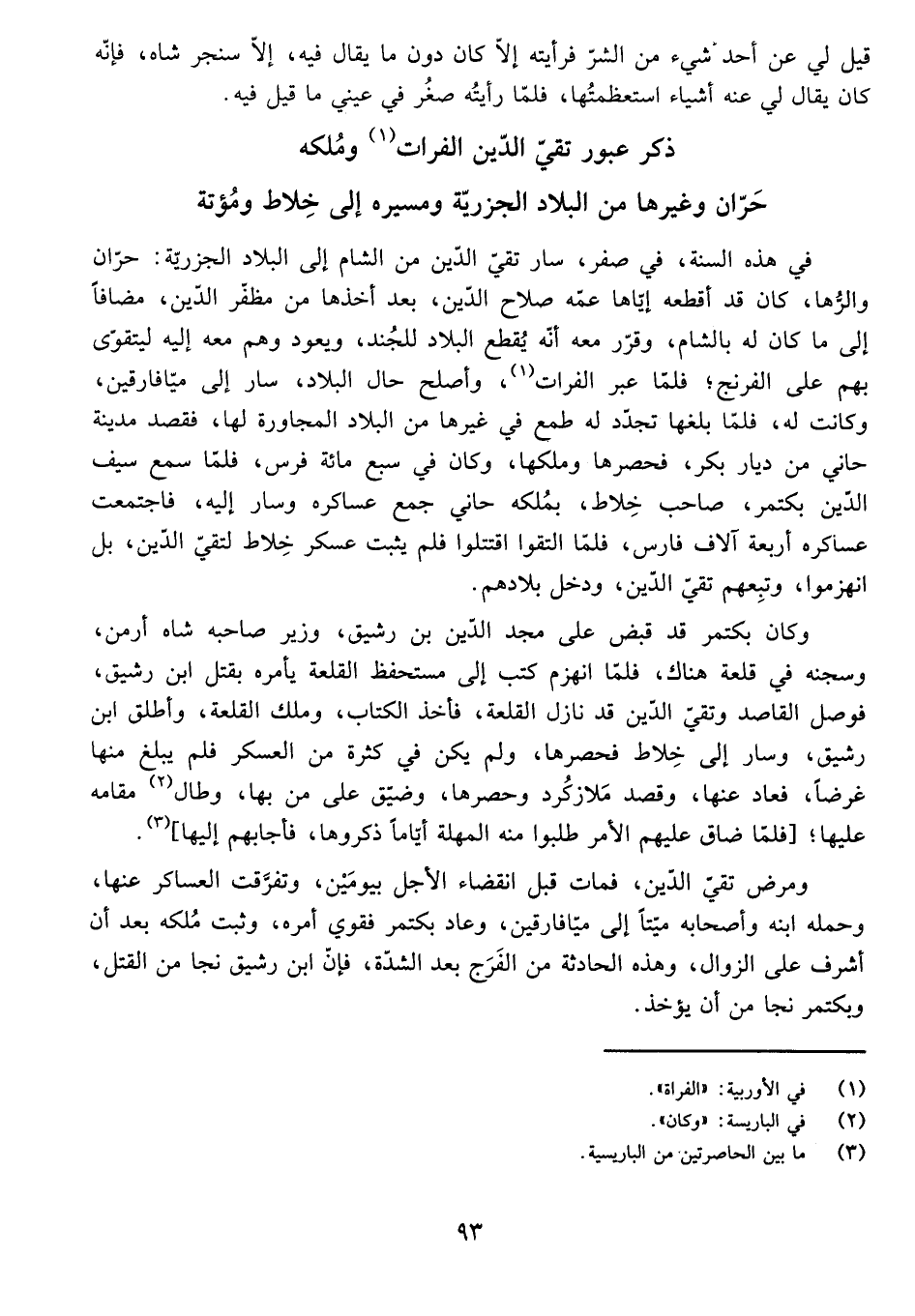 ذِكْرُ عُبُورِ تَقِيِّ الدِّينِ الْفُرَاتَ وَمُلْكِهِ حَرَّانَ وَغَيْرِهَا مِنِ الْبِلَادِ الْجَزَرِيَّةِ، وَمِسِيرِهِ إِلَى خِلَاطَ وَمُؤْتَةَ