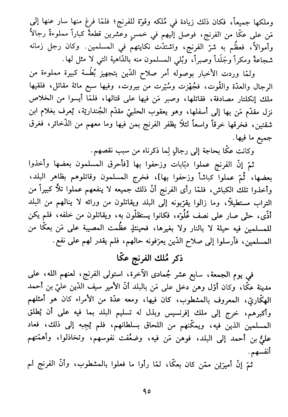 فِي يَوْمِ الْجُمُعَةِ، سَابِعَ عَشَرَ جُمَادَى الْآخِرَةِ، اسْتَوْلَى الْفِرِنْجُ - لَعَنَهُمُ اللَّهُ - عَلَى مَدِينَةِ عَكَّا، وَكَانَ أَوَّلُ وَهْنٍ دَخَلَ عَلَى مَنْ بِالْبَلَدِ أَنَّ الْأَمِيرَ سَيْفَ الدِّينِ عَلِيَّ بْنَ أَحْمَدَ الْهَكَّارِيَّ الْمَعْرُوفَ بِالْمَشْطُوبِ، كَانَ فِيهَا، وَمَعَهُ عِدَّةٌ مِنَ الْأُمَرَاءِ كَانَ هُوَ أَمْثَلَهُمْ وَأَكْبَرَهُمْ، خَرَجَ إِلَى مَلِكِ إِفْرَنْسِيسَ وَبَذَلَ لَهُ تَسْلِيمَ الْبَلَدِ بِمَا فِيهِ عَلَى أَنْ يُطْلِقَ الْمُسْلِمِينَ الَّذِينَ فِيهِ، وَيُمَكِّنَهُمْ مِنَ اللَّحَاقِ بِسُلْطَانِهِمْ، فَلَمْ يُجِبْهُ إِلَى ذَلِكَ، فَعَادَ عَلِيُّ بْنُ أَحْمَدَ إِلَى الْبَلَدِ، فَوَهَنَ مَنْ فِيهِ، وَضَعُفَتْ نُفُوسُهُمْ، وَتَخَاذَلُوا، وَأَهَمَّتْهُمْ أَنْفُسُهُمْ.