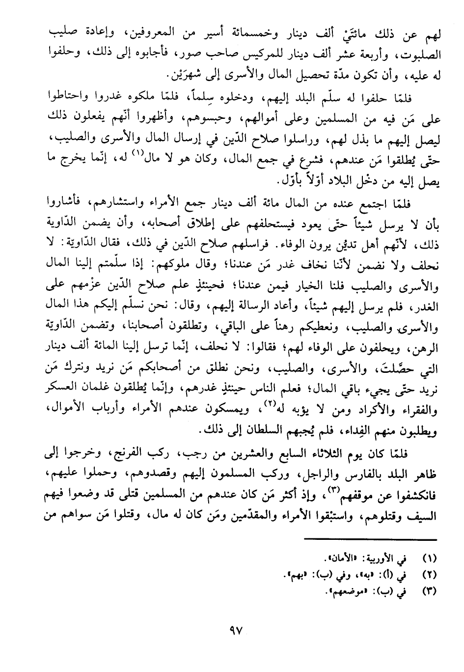 وَقَالَ مُلُوكُهُمْ: إِذَا سَلَّمْتُمْ إِلَيْنَا الْمَالَ وَالْأَسْرَى وَالصَّلِيبَ فَلَنَا الْخِيَارُ فِيمَنْ عِنْدَنَا فَحِينَئِذٍ عَلِمَ صَلَاحُ الدِّينِ عَزْمَهُمْ عَلَى الْغَدْرِ، فَلَمْ يُرْسِلْ إِلَيْهِمْ شَيْئًا، وَأَعَادَ الرِّسَالَةَ إِلَيْهِمْ، وَقَالَ: نَحْنُ نُسَلِّمُ إِلَيْكُمْ هَذَا الْمَالَ وَالْأَسْرَى وَالصَّلِيبَ، وَنُعْطِيكُمْ رَهْنًا عَلَى الْبَاقِي وَتُطْلِقُونَ أَصْحَابَنَا، وَتَضْمَنُ الدَّاوِيَّةُ الرَّهْنَ، وَيَحْلِفُونَ عَلَى الْوَفَاءِ لَهُمْ.