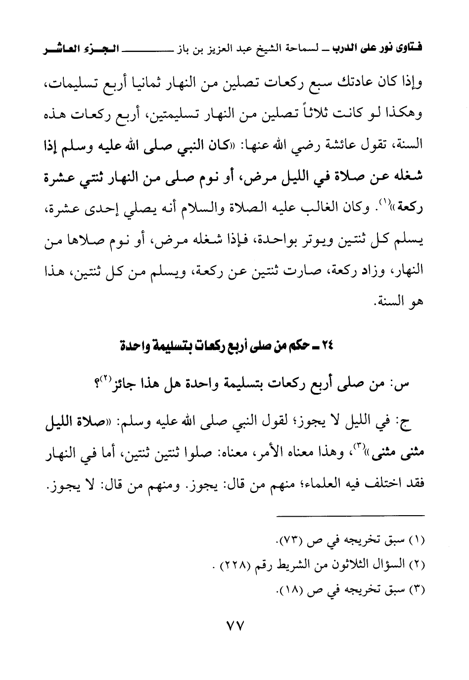 وإذا كان عادتك سبع ركعات تصلين من النهار ثمانيا أربع تسليمات، وهكذا لو كانت ثلاثا تصلين من النهار تسليمتين، أربع ركعات هذه السنة، تقول عائشة رضي الله عنها: «كان النبي صلى الله عليه وسلم إذا شغله عن صلاة في الليل مرض، أو نوم صلى من النهار ثنتي عشرة ركعة (¬1)» وكان الغالب عليه الصلاة والسلام أنه يصلي إحدى عشرة، يسلم كل ثنتين ويوتر بواحدة، فإذا شغله مرض أو نوم صلاها من النهار وزاد ركعة صارت ثنتين عن ركعة، ويسلم من كل ثنتين، هذا هو السنة.