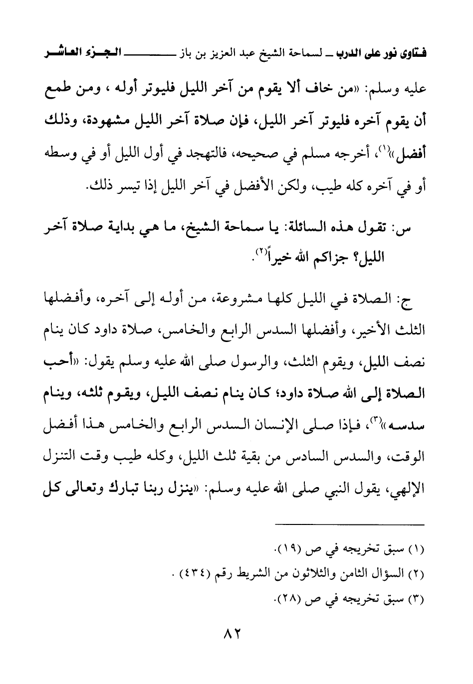 ج: الصلاة في الليل كلها مشروعة، من أوله إلى آخره، وأفضلها الثلث الأخير، وأفضلها السدس الرابع والخامس، صلاة داود كان ينام نصف الليل ويقوم الثلث، والرسول صلى الله عليه وسلم يقول: «أحب الصلاة إلى الله صلاة داود؛ كان ينام نصف الليل، ويقوم ثلثه، وينام سدسه (¬2)» فإذا صلى الإنسان السدس الرابع والخامس هذا أفضل الوقت، والسدس السادس من بقية ثلث الليل، وكله طيب وقت التنزل الإلهي، يقول النبي صلى الله عليه وسلم: «ينزل ربنا تبارك وتعالى كل