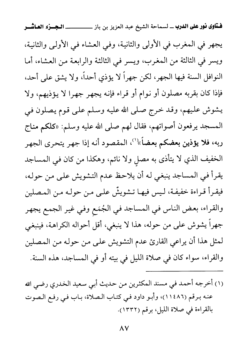 (¬1) أخرجه أحمد في مسند المكثرين من حديث أبي سعيد الخدري رضي الله عنه برقم (11486)، وأبو داود في كتاب الصلاة، باب في رفع الصوت بالقراءة في صلاة الليل، برقم (1332).
