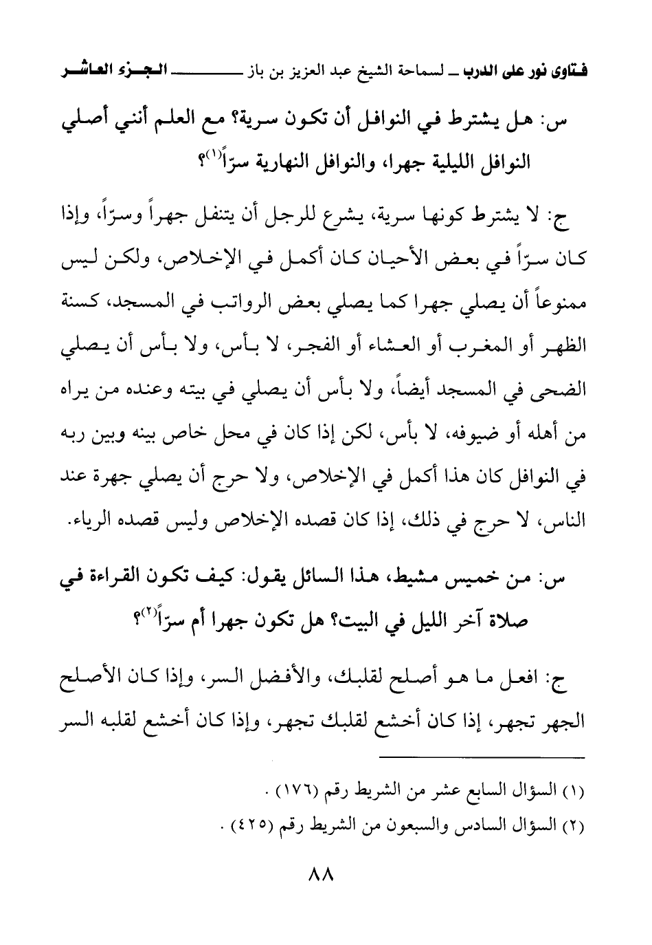 س: من خميس مشيط، هذا السائل يقول: كيف تكون القراءة في صلاة آخر الليل في البيت؟ هل تكون جهرا أم سرا؟ (¬1)