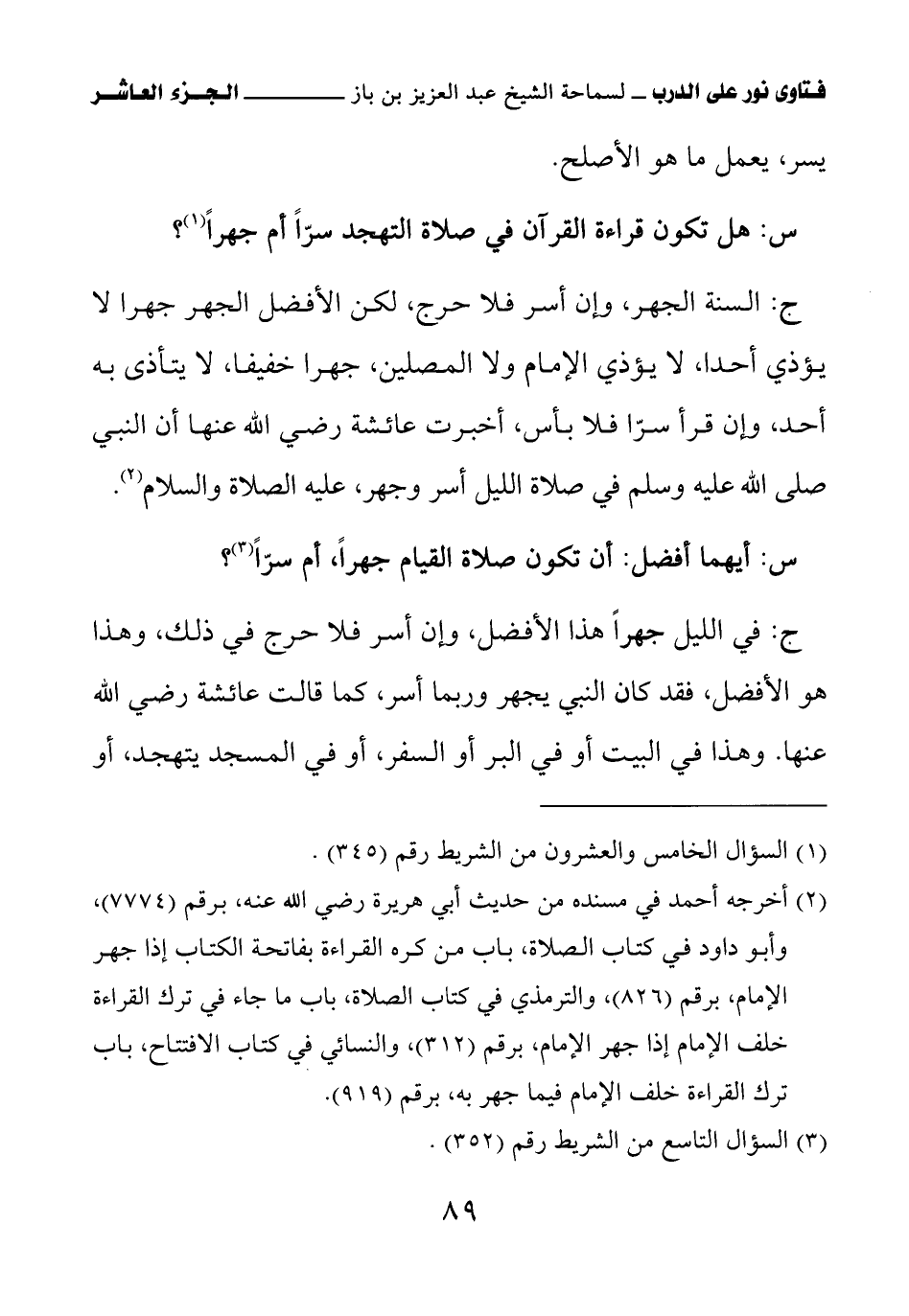 س: أيهما أفضل: أن تكون صلاة القيام جهرا، أم سرا؟ (¬1)