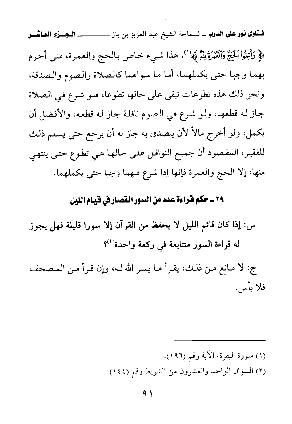 {وَأَتِمُّوا الْحَجَّ وَالْعُمْرَةَ لِلَّهِ} (¬1) هذا شيء خاص بالحج والعمرة، متى أحرم بهما وجبا حتى يكملهما، أما ما سواهما كالصلاة والصوم والصدقة، ونحو ذلك هذه تطوعات تبقى على حالها تطوعا، فلو شرع في الصلاة جاز له قطعها، ولو شرع في الصوم نافلة جاز له قطعه، والأفضل أن يكمل، ولو أخرج مالا لأن يتصدق به جاز له أن يرجع حتى يسلم ذلك للفقير، المقصود أن جميع النوافل على حالها هي تطوع حتى ينتهي منها، إلا الحج والعمرة فإنها إذا شرع فيهما وجبا حتى يكملهما.