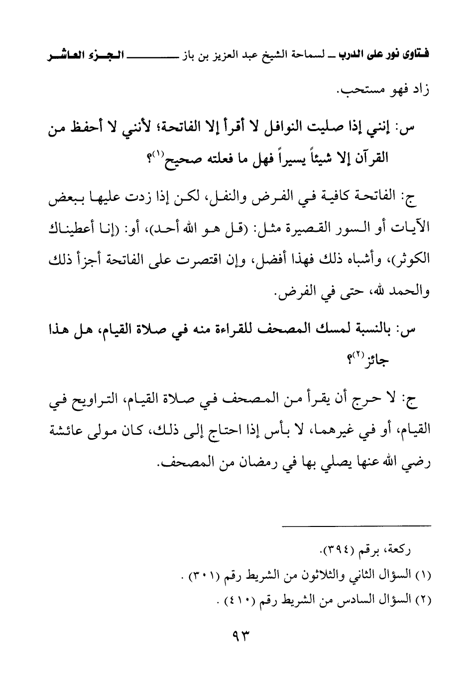ج: الفاتحة كافية في الفرض والنفل، لكن إذا زدت عليها ببعض الآيات أو السور القصيرة مثل: {قُلْ هُوَ اللَّهُ أَحَدٌ} (¬2)، أو: {إِنَّا أَعْطَيْنَاكَ الْكَوْثَرَ} (¬3)، وأشباه ذلك فهذا أفضل، وإن اقتصرت على الفاتحة أجزأ ذلك والحمد لله، حتى في الفرض.