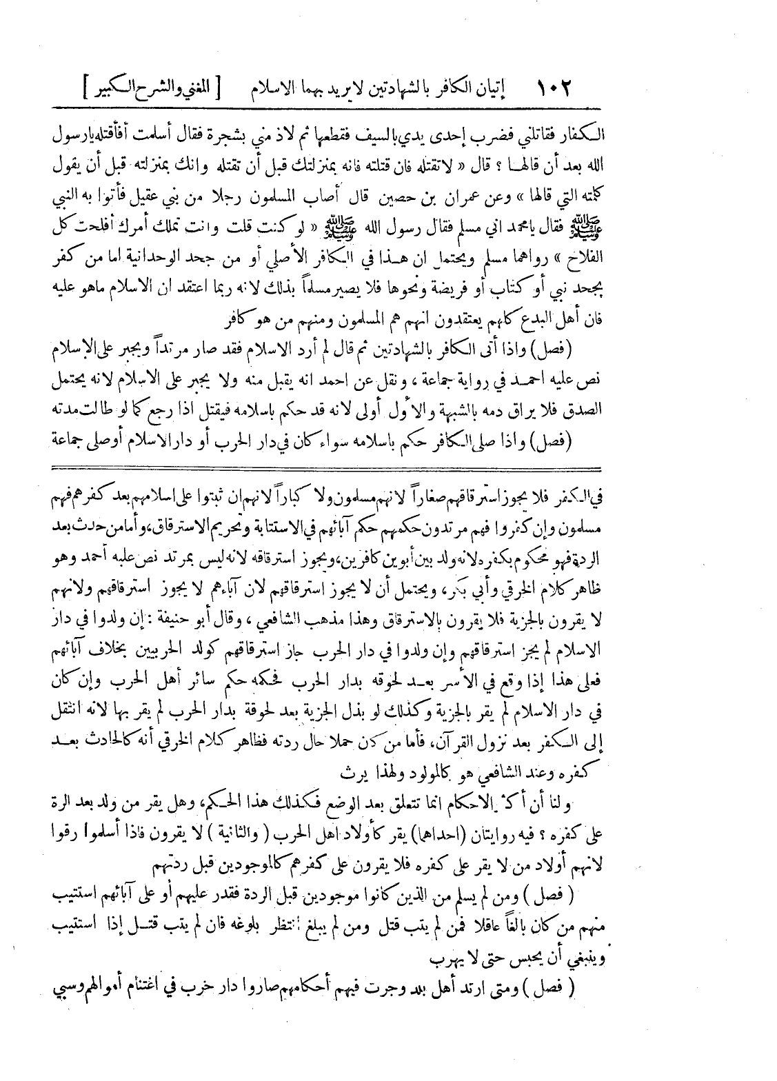 ظاهر كلام الخرقي وأبي بكر، ويحتمل أن لا يجوز استرقاقهم لأن آباءهم لا يجوز استرقاقهم ولأنهم لا يقرون بالجزية فلا يقرون بالاسترقاق وهذا مذهب الشافعي، وقال أبو حنيفة: إن ولدوا في دار الإسلام لم يجز استرقاقهم وإن ولدوا في دار الحرب جاز استرقاقهم كولد الحربيين بخلاف آبائهم فعلى هذا إذا وقع في الأسر بعد لحوقه بدار الحرب فحكمه حكم سائر أهل الحرب وإن كان في دار الإسلام لم يقر بالجزية وكذلك لو بذل الجزية بعد لحوقه بدار الحرب لم يقر بها لأنه انتقل إلى الكفر بعد نزول القرآن، فأما من كان حملاً حال ردته فظاهر كلام الخرقي أنه كالحادث بعد كفره وعند الشافعي هو كالمولود ولهذا يرث ولنا أن أكثر الأحكام إنما تتعلق بعد الوضع فكذلك هذا الحكم، وهل يقر من ولد بعد الردة على كفره؟ فيه روايتان (إحداهما) يقر كأولاد اهل الحرب (والثانية) لا يقرون فاذا أسلموا رقوا لانهم أولاد من لا يقر على كفره فلا يقرون على كفرهم كالموجودين قبل ردتهم (فصل) ومن لم يسلم من الذين كانوا موجودين قبل الردة فقدر عليهم أو على آبائهم استتيب منهم من كان بالغاً عاقلا فمن لم يتب قتل ومن لم يبلغ انتظر بلوغه فان لم يتب قتل إذا استتيب وينبغي أن يحبس حتى لا يهرب (فصل) ومتى ارتد أهل بلد وجرت فيهم أحكامهم صاروا دار خرب في اغتنام أموالهم وسبي