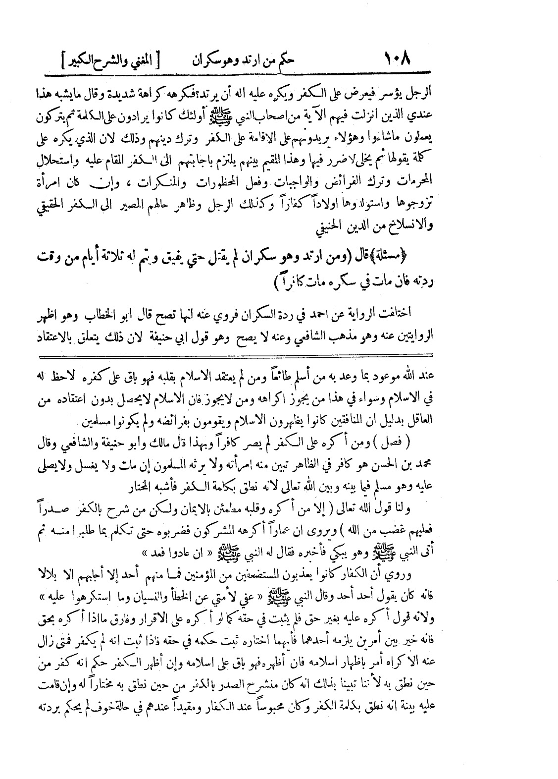 عند الله موعود بما وعد به من اسلم طائعاً ومن لم يعتقد الاسلام بقلبه فهو باق على كفره لاحظ له في الاسلام وسواء في هذا من يجوز إكراهه ومن لا يجوز فان الاسلام لا يحصل بدون اعتقاده من العاقل بدليل أن المنافقين كانوا يظهرون الاسلام ويقومون بفرائضه ولم يكونوا مسلمين (فصل) ومن أكره على الكفر لم يصر كافراً وبهذا قال مالك وابو حنيفة والشافعي وقال محمد بن الحسن هو كافر في الظاهر تبين منه امرأته ولا يرثه المسلمون إن مات ولا يغسل ولا يصلى عليه وهو مسلم فيما بينه وبين الله تعالى لأنه نطق بكلمة الكفر فأشبه المختار ولنا قول الله تعالى (إلا من أكره وقلبه مطمئن بالإيمان ولكن من شرح بالكفر صدرا فعليهم غضب من الله) ويروى ان عماراً أكرهه المشركون فضربوه حتى تكلم بما طلبوا منه ثم أتى النبي صلى الله عليه وسلم وهو يبكي فأخبره فقال له النبي صلى الله عليه وسلم (إن عادوا فعد) وروي أن الكفار كانوا يعذبون المستضعفين من المؤمنين فما منهم أحد إلا أجلبهم إلا بلالاً فانه كان يقول أحد أحد وقال النبي صلى الله عليه وسلم (عفي لأمتي عن الخطأ والنسيان وما استكرهوا عليه) ولأنه قول أكره عليه بغير حق فلم يثبت في حقه كما لو أكره على الاقرار وفارق ما إذا أكره بحق فانه خير بين أمرين يلزمه أحدهما فأيهما اختاره ثبت حكمه في حقه فاذا ثبت أنه لم يكفر فمتى زال