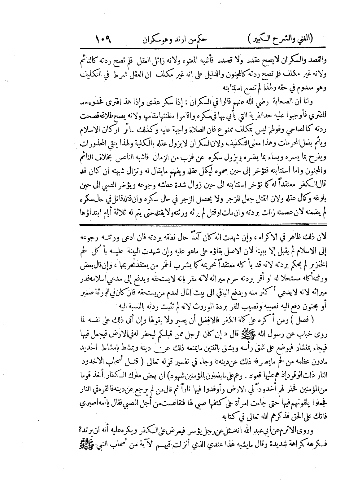 لأن ذلك ظاهر في الإكراه، وإن شهدت أنه كان آمناً حال نطقه بردته فإن ادعى ورثته رجوعه إلى الاسلام لم يقبل إلا ببينة لأن الاصل بقاؤه على ما هو عليه وإن شهدت البينة عليه بأكل لحم الخنزير لم يحكم بردته لأنه قد يأكله معتقداً تحريمه كما يشرب الخمر من يعتقد تحريمها، وإن قال بعض ورثته أكله مستحلاً له او أقر بردته حرم ميراثه لأنه مقر بأنه لا يستحقه ويدفع إلى مدعي إسلامه قدر ميراثه لأنه لا يدعي أكثر منه ويدفع الباقي الى بيت المال لعدم من يستحقه فان كان في الورثة صغير أو مجنون دفع اليه نصيبه ونصيب المقر بردة الموروث لأنه لم تثبت ردته بالنسبة اليه (فصل) ومن أكره على كلمة الكفر فالأفضل أن يصبر ولا يقولها وإن أتى ذلك على نفسه لما روى خباب عن رسول الله صلى الله عليه وسلم قال (إن كان الرجل ممن قبلكم ليحفر له في الارض فيجعل فيها فيجاء بمنشار فيوضع على شق رأسه ويشق باثنتين ما يمنعه ذلك عن دينه ويمشط بامشاط الحديد ما دون عظمه من لحم ما يصرفه ذلك عن دينه) وجاء في تفسير قوله تعالى (قتل أصحاب الأخدود النار ذات الوقود إذ هم عليها قعود.
