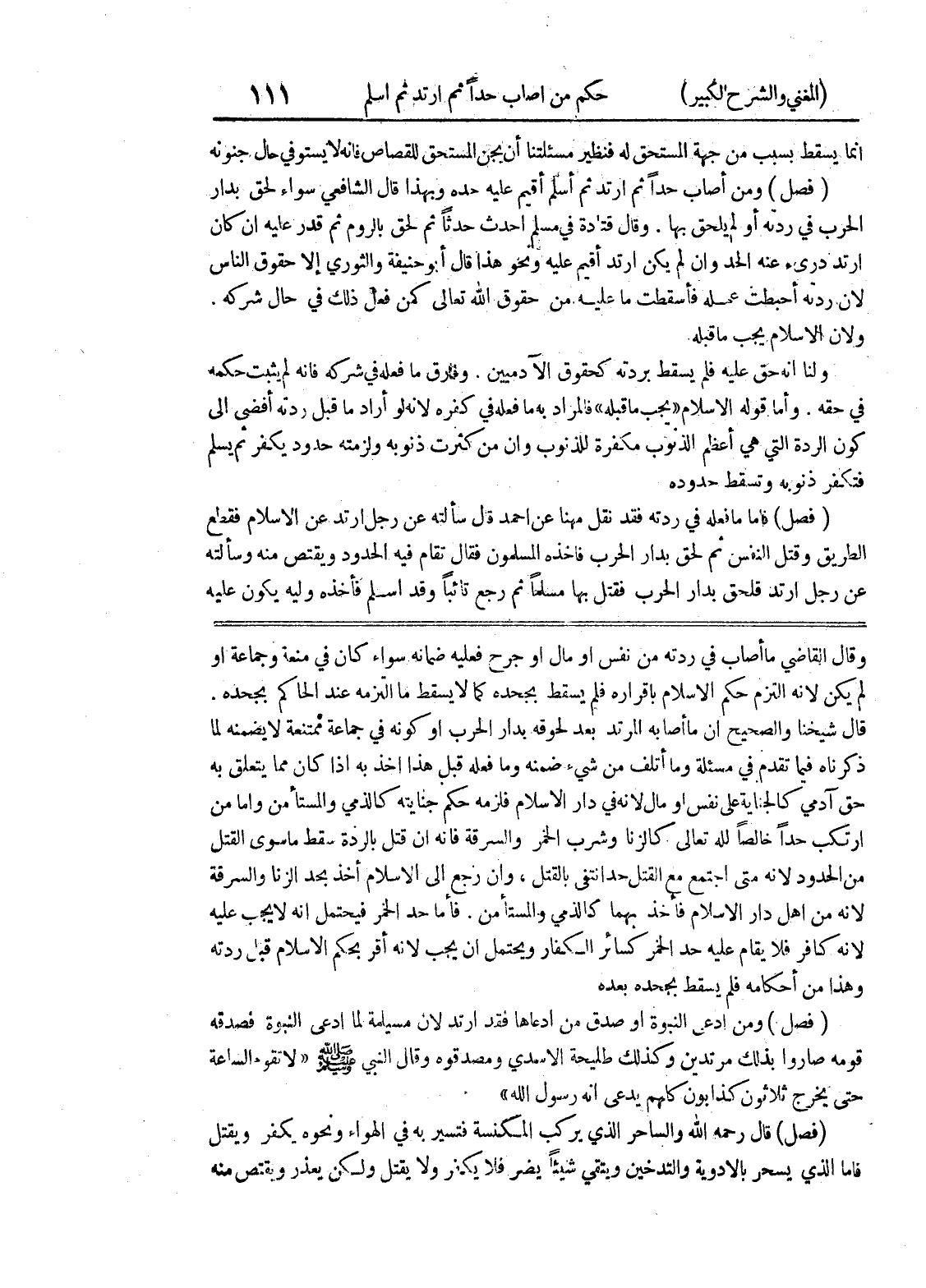 فأما حد الخمر فيحتمل انه لا يجب عليه لأنه كافر فلا يقام عليه حد الخمر كسائر الكفار ويحتمل أن يجب لأنه أقر بحكم الاسلام قبل ردته وهذا من أحكامه فلم يسقط بجحده بعده (فصل) ومن ادعى النبوة أو صدق من ادعاها فقد ارتد لأن مسيلمة لما ادعى النبوة فصدقه قومه صاروا بذلك مرتدين وكذلك طليحة الاسدي ومصدقوه وقال النبي صلى الله عليه وسلم (لا تقوم الساعة حتى يخرج ثلاثون كذابون كلهم يدعي أنه رسول الله) (فصل) قال رحمه الله والساحر الذي يركب المكنسة فتسير به في الهواء ونحوه يكفر ويقتل فأما الذي يسحر بالأدوية والتدخين ويتقي شيئاً يضر فلا يكفر ولا يقتل ولكن يعذر ويقتص منه
