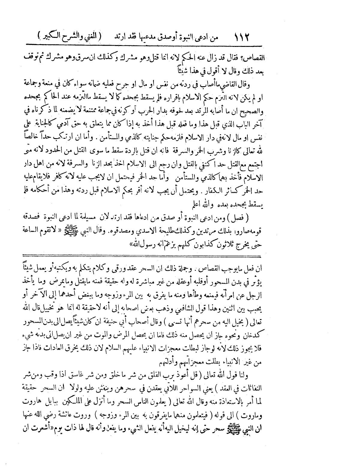 وجملة ذلك أن السحر عقد ورقى وكلام يتكلم به ويكتبه أو يعمل شيئاً يؤثر في بدن المسحور أو قلبه أو عقله من غير مباشرة له وله حقيقة فمنه ما يقتل وما يمرض وما يأخذ الرجل عن امرأته فيمنعه وطأها ومنه ما يفرق به بين المرء وزوجه وما يبغض أحدهما إلى الآخر أو يجب بين اثنين وهذا قول الشافعي وذهب بعض أصحابه إلى أنه لا حقيقة له إنما هو تخييل قال الله تعالى (يخيل إليه من سحرهم أنها تسعى) وقال أصحاب أبي حنيفة إن كان شيئاً يصل الى بدن المسحور كدخان ونحوه جاز أن يحصل منه ذلك فأما ان يحصل المرض والموت من غير أن يصل انى بدنه شئ فلا يجوز ذلك لأنه لو جاز لبطلت معجزات الأنبياء عليهم السلام لأن ذلك يخرق العادات فاذا جاز من غير الأنبياء بطلت معجزاتهم وأدلتهم ولنا قول الله تعالى (قل أعوذ برب الفلق من شر ما خلق ومن شر غاسق إذا وقب ومن شر النفاثات في العقد) يعني السواحر اللاتي يعقدن في سحرهن وينفثن عليه ولولا أن السحر حقيقة لما أمر بالاستعاذة منه وقال الله تعالى (يعلمون الناس السحر وما أنزل على الملكين ببابل هاروت وماروت) الى قوله (فيتعلمون منهما ما يفرقون به بين المرء وزوجه) وروت عائشة رضي الله عنها