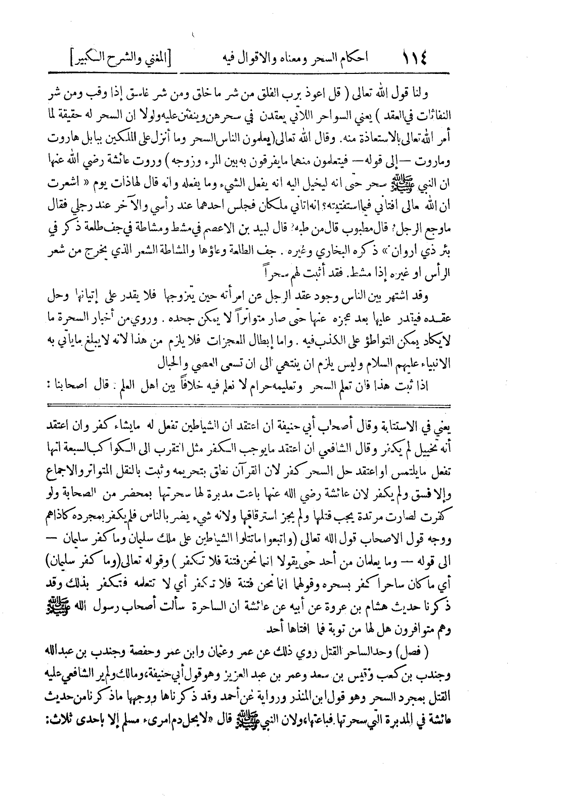 أي ماكان ساحراً كفر بسحره وقولهما إنما نحن فتنة فلا تكفر أي لا تتعلمه فتكفر بذلك وقد ذكرنا حديث هشام بن عروة عن أبيه عن عائشة أن الساحرة سألت أصحاب رسول الله صلى الله عليه وسلم وهم متوافرون هل لها من توبة فما أفتاها أحد (فصل) وحد الساحر القتل روى ذلك عن عمر وعثمان وابن عمر وحفصة وجندب بن عبد الله وجندب بن كعب وقيس بن سعد وعمر بن عبد العزيز وهو قول أبي حنيفة، ومالك ولم ير الشافعي عليه القتل بمجرد السحر وهو قول ابن المنذر ورواية عن أحمد وقد ذكرناها ووجهها ما ذكرنا من حديث عائشة في المدبرة التي سحرتها فباعتها، ولأن النبي صلى الله عليه وسلم قال (لا يحل دم امرئ مسلم إلا باحدى ثلاث: