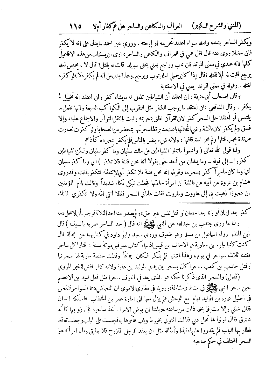 كفر بعد إيمان أو زنا بعد إحصان أو قتل نفس بغير حق) ولم يصدر منه أحد الثلاثة فوجب أن لا يحل دمه ولنا ما روى جندب بن عبد الله عن النبي صلى الله عليه وسلم أنه قال (حد الساحر ضربه بالسيف) قال إبن المنذر رواه اسماعيل بن مسلم وهو ضعيف وروى سعيد وابو داود في كتابيهما عن بجالة قال كنت كاتبا لجزء بن معاوية عم الاحنف بن قيس إذ جاء كتاب عمر قبل موته بسنة: اقتلوا كل ساحر فقتلنا ثلاث سواحر في يوم، وهذا اشتهر فلم ينكر فكان إجماعاً وقتلت حفصة جارية لها سحرتها وقتل جندب بن كعب ساحرا كان يسحر بين يدي الوليد بن عقبة ولأنه كافر فقتل للخبر المروي (فصل) والسحر الذي ذكرنا حكمه هو الذي يعد في العرف سحراً مثل فعل لبيد بن الأعصم حين سحر النبي صلى الله عليه وسلم في مشط ومشاطة، وروينا في مغازي الأموي أن النجاشي دعا السواحر فنفخن في احليل عمارة بن الويد فهام مع الوحش فلم يزل معها إلى إمارة عمر بن الخطاب فأمسكه إنسان فقال خلني وإلا مت فلم يخله فمات من ساعته، وبلغنا أن بعض الأمراء أخذ ساحرة فجاء زوجها كأنه محترق فقال قولوا لها تحل عني فقالت ائتوني بخيوط وباب فأتوها به فجلست على الباب وجعلت تعقد فطار بها الباب فلم يقدروا عليها، فهذا وأمثاله مثل أن يعقد الرجل المتزوج فلا يطيق وطئ امرأته هو السحر المختلف في حكم صاحبه