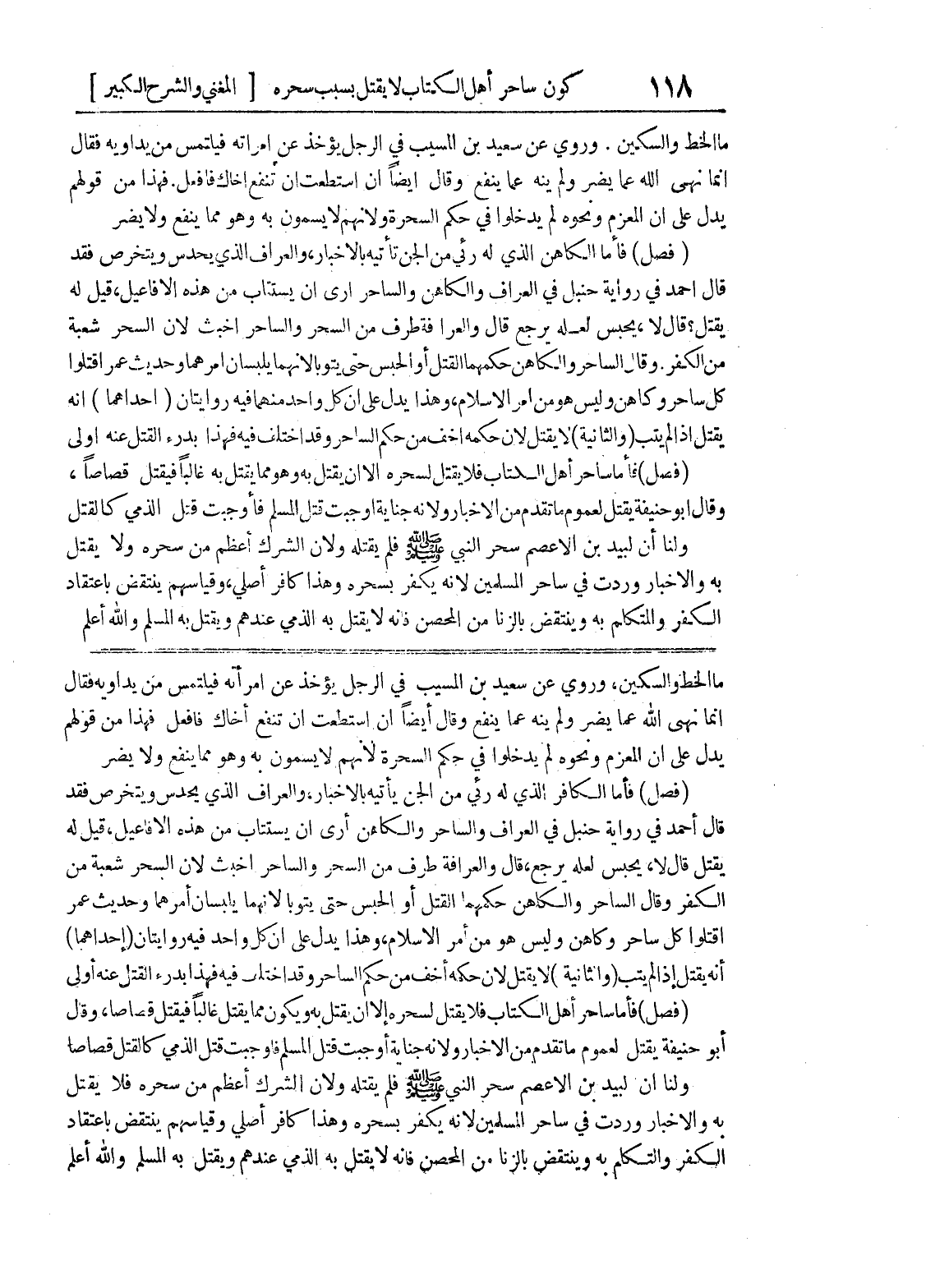 أنه يقتل إذا لم يتب (والثانية) لا يقتل لأن حكمه أخف من حكم الساحر وقد اختلف فيه فهذا بدرء القتل عنه أولى (فصل) فأما ساحر أهل الكتاب فلا يقتل لسحره إلا ان يقتل به ويكون مما يقتل غالباً فيقتل قصاصا، وقال أبو حنيفة يقتل لعموم ما تقدم من الأخبار ولأنه جناية أوجبت قتل المسلم فأوجبت قتل الذمي كالقتل قصاصا ولنا أن لبيد بن الأعصم سحر النبي صلى الله عليه وسلم فلم يقتله ولأن الشرك أعظم من سحره فلا يقتل به والاخبار وردت في ساحر المسلمين لأنه يكفر بسحره وهذا كافر أصلي وقياسهم ينتقض باعتقاد الكفر والتكلم به وينتقض بالزنا من المحصن فانه لا يقتل به الذمي عندهم ويقتل به المسلم والله أعلم