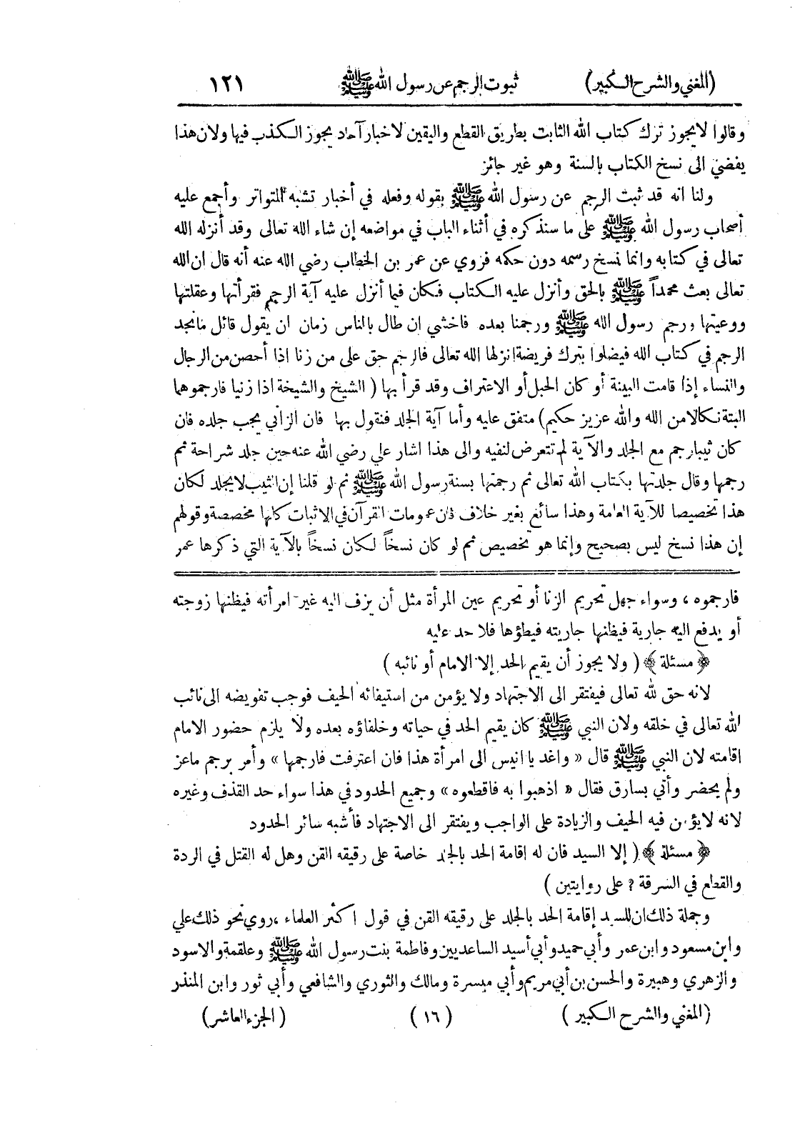 والقطع في السرقة؟ على روايتين) وجملة ذلك ان للسيد إقامة الحد بالجلد على رقيقه القن في قول أكثر العلماء، روي نحو ذلك علي وابن مسعود وابن عمر وأبي حميد وأبي أسيد الساعديين وفاطمة بنت رسول الله صلى الله عليه وسلم وعلقمة والاسود والزهري وهبيرة والحسن بن أبي مريم وأبي ميسرة ومالك والثوري والشافعي وأبي ثور وابن المنذر