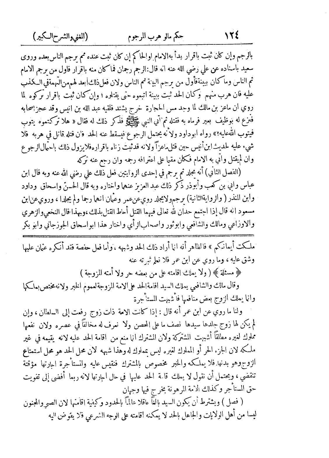 الزوج وهو بدنها فلا يملكه والخبر مخصوص بالمشترك فنقيس عليه والمستأجرة إجارتها مؤقتة تنقضي، ويحتمل أن نقول لا يملك إقامة الحد عليها في حال إجارتها لأنه ربما أفضى إلى تفويت حق المستأجر وكذلك الامة المرهونة يخرج فيها وجهان (فصل) ويشترط أن يكون السيد بالغاً عاقلاً عالماً بالحدود وكيفية إقامتها لأن الصبي والمجنون ليسا من أهل الولايات والجاهل بالحد لا يمكنه اقامته على الوجه الشرعي فلا يفوض اليه