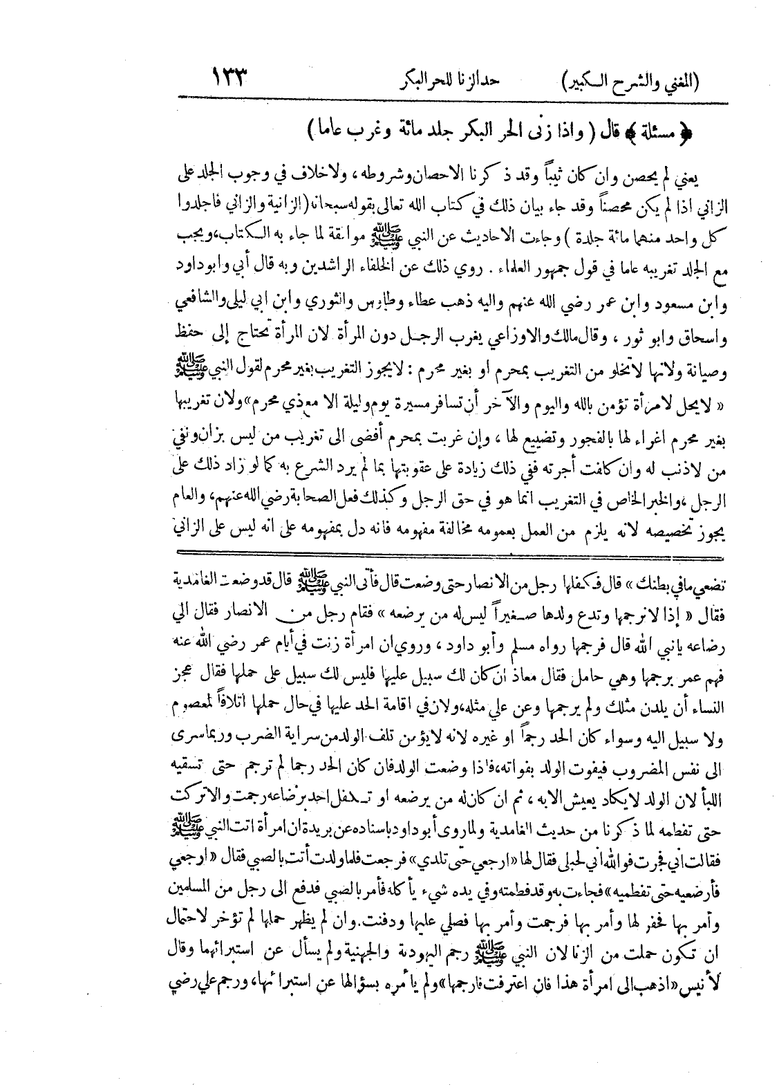 تضعي ما في بطنك) قال فكفلها رجل من الأنصار حتى وضعت قال فأتى النبي صلى الله عليه وسلم قال قد وضعت الغامدية فقال (إذاً لا نرجمها وتدع ولدها صغيراً ليس له من يرضعه) فقام رجل من الأنصار فقال إلي رضاعه يا نبي الله قال فرجمها رواه مسلم وأبو داود، وروي أن امرأة زنت في أيام عمر رضي الله عنه فهم عمر برجمها وهي حامل فقال معاذ إن كان لك سبيل عليها فليس لك سبيل على حملها فقال عجز النساء أن يلدن مثلك ولم يرجمها وعن علي مثله، ولان في اقامة الحد عليها في حال حملها إتلافاً لمعصوم ولا سبيل إليه وسواء كان الحد رجماً أو غيره لأنه لا يؤمن تلف الولد من سراية الضرب وربما سرى إلى نفس المضروب فيفوت الولد بفواته، فإذا وضعت الولد فإن كان الحد رجماً لم ترجم حتى تسقيه اللبأ لأن الولد لا يكاد يعيش إلا به، ثم إن كان له من يرضعه أو تكفل احد برضاعه رجمعت وإلا تركت حتى تفطمه لما ذكرنا من حديث الغامدية ولما روى أبو داود باسناده عن بريدة أن امرأة أتت النبي صلى الله عليه وسلم فقالت إني فجرت فوالله إني لحبلى فقال لها (ارجعي حتى تلدي) فرجعت فلما ولدت أتت بالصبي فقال (ارجعي فأرضعيه حتى تفطميه) فجاءت به قد فطمته وفي يده شئ يأكله فأمر بالصبي فدفع إلى رجل من المسلمين وأمر بها فحفر لها وأمر بها فرجمت وأمر بها فصلي عليها ودفنت.