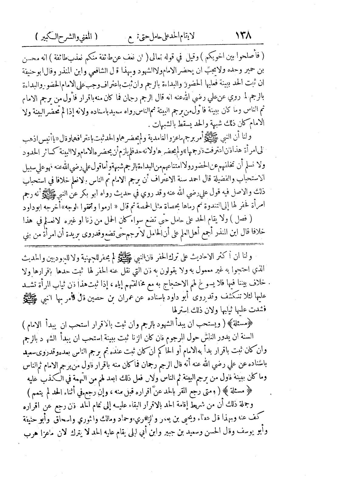 عليها لئلا تنكشف وقد روى أبو داود باسناده عن عمران بن حصين قال فأمر بها النبي صلى الله عليه وسلم فشدت عليها ثيابها ولأن ذلك استر لها (مسألة) (ويستحب أن يبدأ الشهود بالرجم وإن ثبت بالاقرار استحب أن يبدأ الامام) السنة أن يدور الناس حول المرجوم فان كان الزنا ثبت ببينة استحب أن يبدأ الشهود بالرجم وإن كان ثبت بإقرار بدأ به الإمام أو الحاكم إن كان ثبت عنده ثم يرجم الناس بعده وقد روى سعيد باسناده عن علي رضي الله عنه أنه قال الرجم رجمان فما كان منه بإقرار فأول من يرجم الامام ثم الناس وما كان ببينة فأول من يرجم البينة ثم الناس ولأن فعل ذلك ابعد لهم من التهمة في الكذب عليه (مسألة) (ومتى رجع المقر بالحد عن إقراره قبل منه، وإن رجع في اثناء الحد لم يتمم) وجملة ذلك أن من شرط إقامة الحد بالاقرار البقاء عليه إلى تمام الحد فان رجع عن إقراره كف عنه وبهذا قال عطاء ويحيى بن يعمر والزهري وحماد ومالك والثوري واسحاق وابو حنيفة وأبو يوسف وقال الحسن وسعيد بن جبير وابن أبي ليلى يقام عليه الحد لا يترك لأن ماعزا هرب