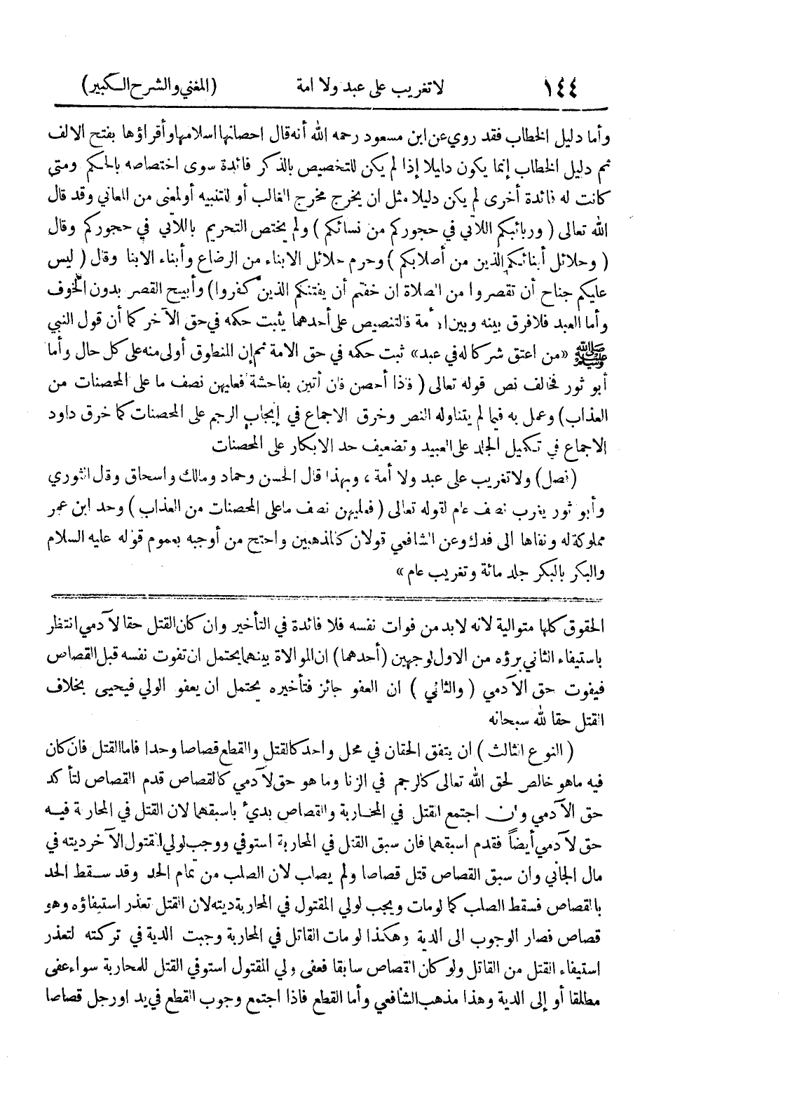 فيفوت حق الآدمي (والثاني) أن العفو جائز فتأخيره يحتمل أن يعفو الولي فيحيى بخلاف القتل حقا لله سبحانه (النوع الثالث) أن يتفق الحقان في محل واحد كالقتل والقطع قصاصاً وحداً فأما القتل فان كان فيه ما هو خالص لحق الله تعالى كالرجم في الزنا وما هو حق لآدمي كالقصاص قدم القصاص لتأكد حق الآدمي وإن اجتمع القتل في المحاربة والقصاص بدئ بأسبقهما لأن القتل في المحاربة فيه حق لآدمي أيضاً فقدم أسبقهما فإن سبق القتل في المحاربة استوفي ووجب لولي المقتول الآخر ديته في مال الجاني وإن سبق القصاص قتل قصاصاً ولم يصلب لأن الصلب من تمام الحد وقد سقط الحد بالقصاص فسقط الصلب كما لو مات ويجب لولي المقتول في المحاربة ديته لأن القتل تعذر استيفاؤه وهو قصاص فصار الوجوب الى الدية وهكذا لو مات القاتل في المحاربة وجبت الدية في تركته لتعذر استيفاء القتل من القاتل ولو كان القصاص سابقا فعفى ولي المقتول استوفي القتل للمحاربة سواء عفى مطلقاً أو إلى الدية وهذا مذهب الشافعي وأما القطع فإذا اجتمع وجوب القطع في يد أو رجل قصاصاً
