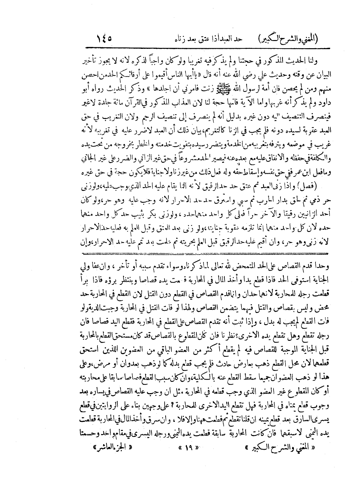 وحداً قدم القصاص على الحد المتمحض لله تعالى لما ذكرناه وسواء تقدم سببه أو تأخر، وإن عفا ولي الجناية استوفى الحد فاذا قطع يداً وأخذ المال في المحاربة قطعت يده قصاصاً وينتظر برؤه فاذا برأ قطعت رجله للمحاربة لأنهما حدان وإنما قدم القصاص في القطع دون القتل لأن القطع في المحاربة حد محض وليس بقصاص والقتل فيهما يتضمن القصاص ولهذا لو فات القتل في المحاربة وجبت الدية ولو فات القطع لم يجب له بدل، وإذا ثبت أنه تقدم القصاص على القطع في المحاربة فقطع اليد قصاصاً فان رجله تقطع وهل تقطع يده الأخرى؟ نظرنا فإن كان المقطوع بالقصاص قد كان مستحق القطع بالمحاربة قبل الجناية الموجبة للقصاص فيه لم يقطع أكثر من العضو الباقي من العضوين اللذين استحق قطعهما لأن محل القطع ذهب بعارض حادث فلم يجب قطع بدله كما لو ذهب بعدوان أو مرض، وعلى هذا لو ذهب العضوان جميعاً سقط القطع عنه بالكلية، وإن كان سبب القطع قصاصاً سابقاً على محاربته أو كان المقطوع غير العضو الذي وجب قطعه في المحاربة مثل ان وجب عليه القصاص في يساره بعد