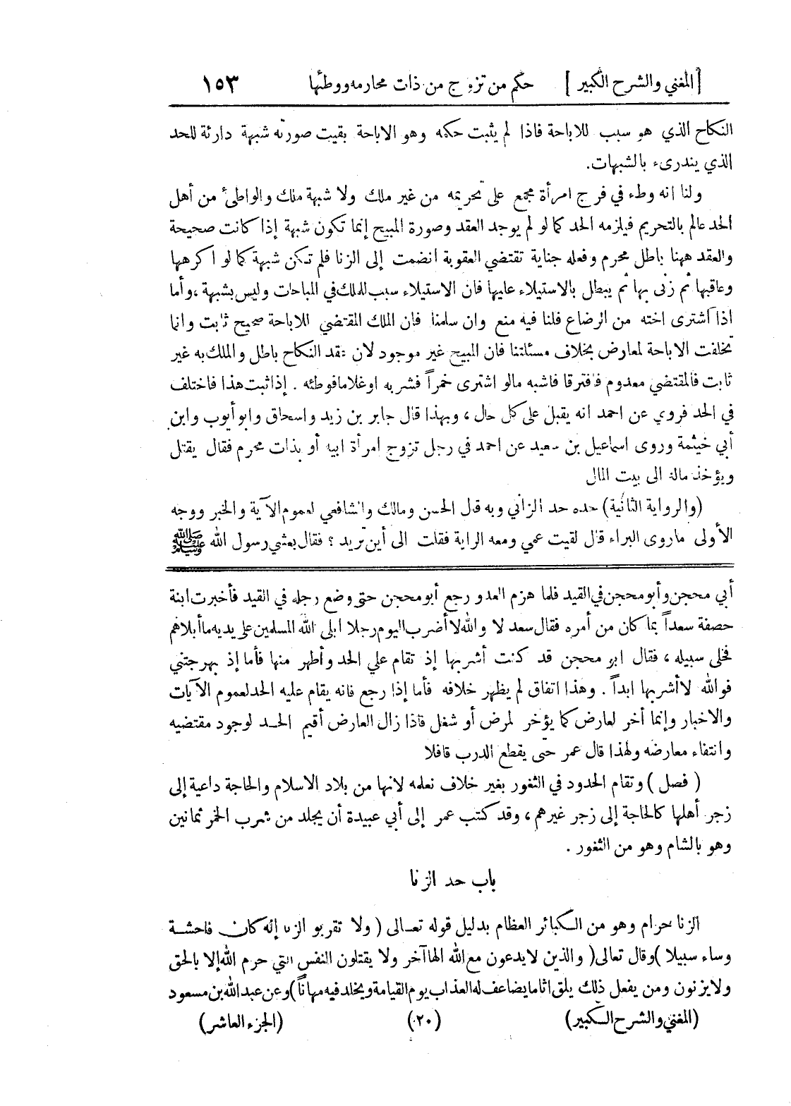 باب حد الزنا الزنا حرام وهو من الكبائر العظام بدليل قوله تعالى (ولا تقربو الزنا إنه كان فاحشة وساء سبيلا) وقال تعالى (والذين لا يدعون مع الله إلها آخر ولا يقتلون النفس التي حرم الله إلا بالحق ولا يزنون ومن يفعل ذلك يلق أثاما يضاعف له العذاب يوم القيامة ويخلد فيه مهانا) وعن عبد الله بن مسعود
