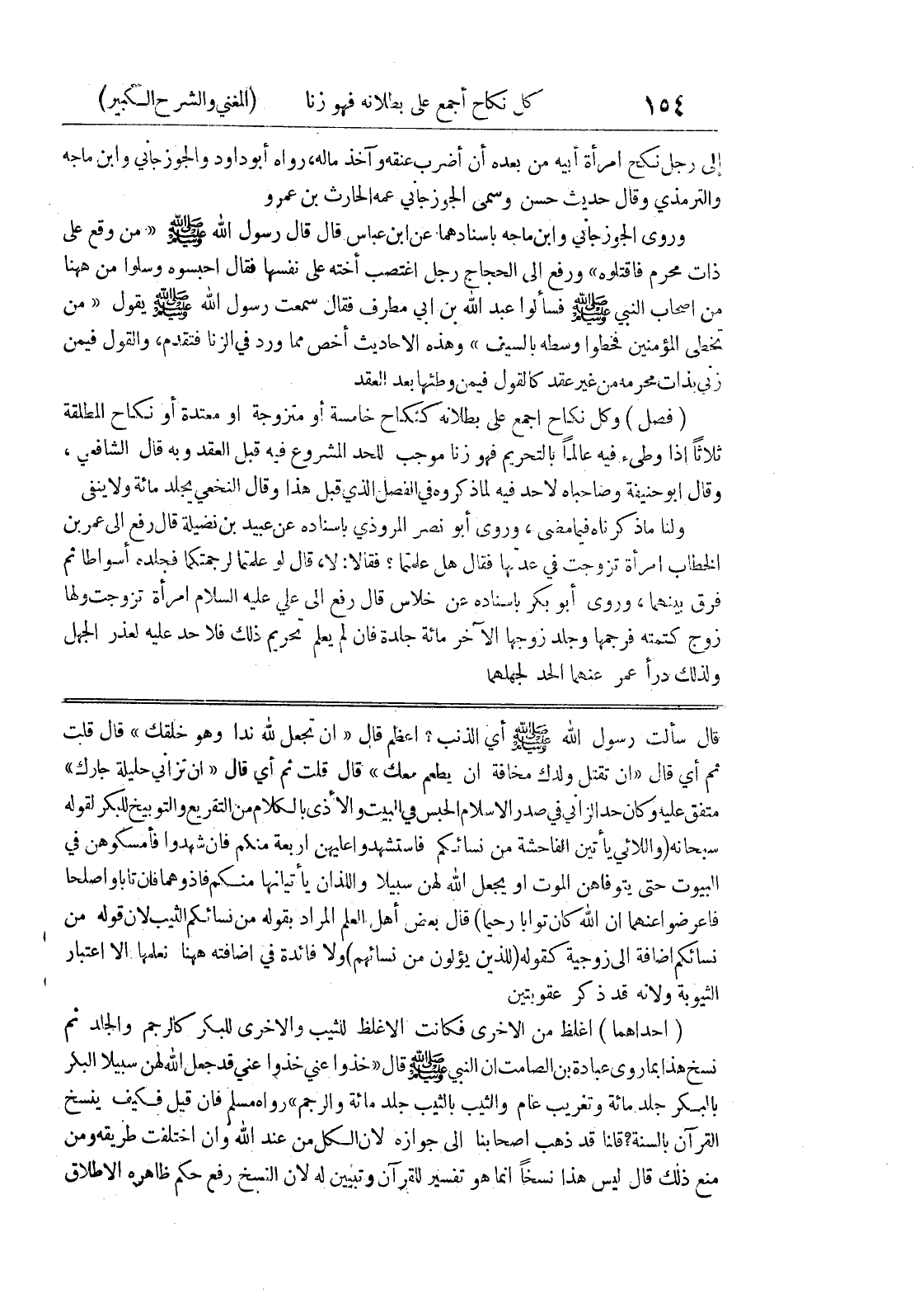 قال سألت رسول الله صلى الله عليه وسلم أي الذنب؟ أعظم قال (أن تجعل لله ندا وهو خلقك) قال قلت ثم أي قال (أن تقتل ولدك مخافة أن يطعم معك) قال قلت ثم أي قال (أن تزاني حليلة جارك) متفق عليه وكان حد الزاني في صدر الاسلام الحبس في البيت والأذى بالكلام من التقريع والتوبيخ للبكر لقوله سبحانه (واللائي يأتين الفاحشة من نسائكم فاستشهدوا عليهن أربعة منكم فإن شهدوا فأمسكوهن في البيوت حتى يتوفاهن الموت أو يجعل الله لهن سبيلا واللذان يأتيانها منكم فآذوهما فإن تابا وأصلحا فأعرضوا عنهما إن الله كان توابا رحيما) قال بعض أهل العلم المراد بقوله من نسائكم الثيب لأن قوله من نسائكم إضافة الى زوجية كقوله (للذين يؤلون من نسائهم) ولا فائدة في اضافته ههنا نعلمها إلا إعتبار الثيوبة ولأنه قد ذكر عقوبتين (إحداهما) أغلظ من الأخرى فكانت الأغلظ للثيب والأخرى للبكر كالرجم والجلد ثم نسخ هذا بما روى عبادة بن الصامت أن النبي صلى الله عليه وسلم قال (خذوا عني خذوا عني قد جعل الله لهن سبيلا البكر بالبكر جلد مائة وتغريب عام والثيب بالثيب جلد مائة والرجم) رواه مسلم فإن قيل فكيف ينسخ القرآن بالسنة؟ قلنا قد ذهب أصحابنا إلى جوازه لأن الكل من عند الله وإن اختلفت طريقه ومن منع ذلك قال ليس هذا نسخاً إنما هو تفسير للقرآن وتبيين له لأن النسخ رفع حكم ظاهره الاطلاق
