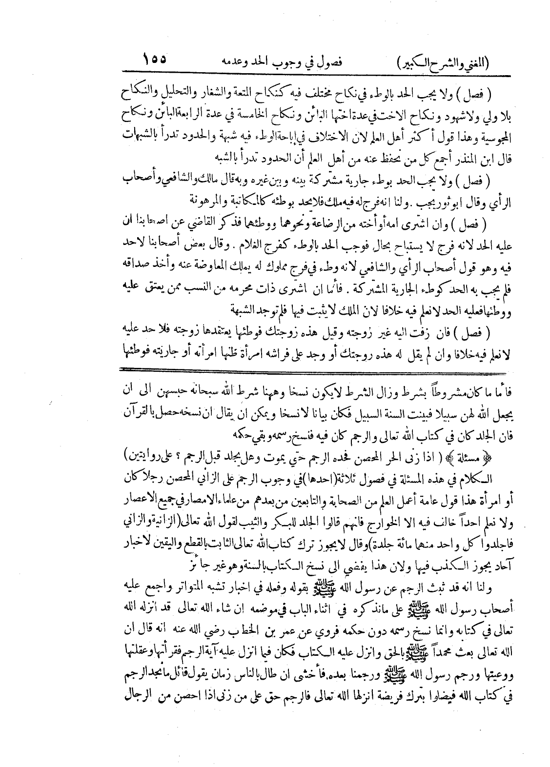 (مسألة) (إذا زنى الحر المحصن فحده الرجم حتى يموت وهل يجلد قبل الرجم؟ على روايتين) الكلام في هذه المسألة في فصول ثلاثة (أحدها) في وجوب الرجم على الزاني المحصن رجلا كان أو امرأة هذا قول عامة أعمل العلم من الصحابة والتابعين من بعدهم من علماء الأمصار في جميع الأعصار ولا نعلم احدا خالف فيه إلا الخوارج فانهم قالوا الجلد للبكر والثيب لقول الله تعالى (الزانية والزاني فاجلدوا كل واحد منهما مائة جلدة) وقال لا يجوز ترك كتاب الله تعالى الثابت بالقطع واليقين لأخبار آحاد يجوز الكذب فيها ولأن هذا يفضي إلى نسخ الكتاب بالسنة وهو غير جائز ولنا أنه قد ثبت الرجم عن رسول الله صلى الله عليه وسلم بقوله وفعله في أخبار تشبه المتواتر وأجمع عليه أصحاب رسول الله صلى الله عليه وسلم على ما نذكره في أثناء الباب في موضعه إن شاء الله تعالى قد أنزله الله تعالى في كتابه وإنما نسخ رسمه دون حكمه فروي عن عمر بن الخطاب رضي الله عنه أنه قال أن الله تعالى بعث محمداً صلى الله عليه وسلم بالحق وأنزل عليه الكتاب فكان فيما أنزل عليه آية الرجم فقرأتها وعقلتها ووعيتها ورجم رسول الله صلى الله عليه وسلم ورجمنا بعده، فأخشى إن طال بالناس زمان يقول قائل ما نجد الرجم في كتاب الله فيضلوا بترك فريضة أنزلها الله تعالى فالرجم حق على من زنى إذا أحصن من الرجال