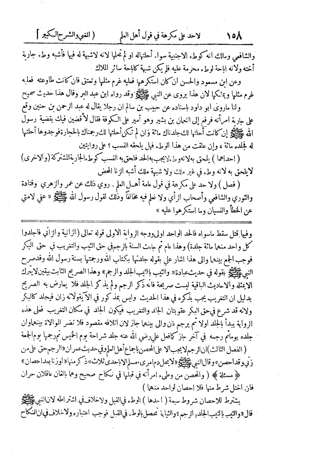 فوجب الجمع بينهما وإلى هذا أشار علي بقوله جلدتها بكتاب الله ورجمتها بسنة رسول الله وقد صرح النبي صلى الله عليه وسلم بقوله في حديث عبادة (والثيب بالثيب الجلد والرجم) وهذا الصريح الثابت بيقين لا يترك إلا بمثله والأحاديث الباقية ليست صريحة فإنه ذكر الرجم ولم يذكر الجلد فلا يعارض به الصريح بدليل أن التغريب يجب بذكره في هذا الحديث وليس بمذكور في الآية ولأنه زان فيجلد كالبكر ولأنه قد شرع في حق البكر عقوبتان الجلد والتغريب فيكون الجلد في مكان التغريب فعلى هذه الرواية يبدأ بالجلد أولا ثم يرجم فإن والى بينهما جاز لأن إتلافه مقصود فلا تضر الموالاة بينهما وإن جلده يوماً ثم رجمه في آخر جاز كما فعل علي رضي الله عنه جلد شراحة يوم الخميس ثم رجمها يوم الجمعة (الفصل الثالث) إن الرجم لا يجب إلا على المحصن بإجماع أهل العلم وفي حديث عمران (الرجم حق على من زنى وقد احصن) وقال النبي صلى الله عليه وسلم (لا يحل دم امرئ مسلم إلا باحدى ثلاث) ذكر منها (أو زنا بعد إحصان) (مسألة) (والمحصن من وطئ امرأته في قبلها في نكاح صحيح وهما بالغان عاقلان حران فان اختل شرط منها فلا إحصان لواحد منهما) يشترط للاحصان شروط سبعة (احدها) الوطئ في القبل ولا خلاف في اشتراطه لأن النبي صلى الله عليه وسلم قال (والثيب بالثيب الجلد والرجم) والثيابة تحصل بالوطئ في القبل فوجب اعتباره ولا خلاف في أن النكاح