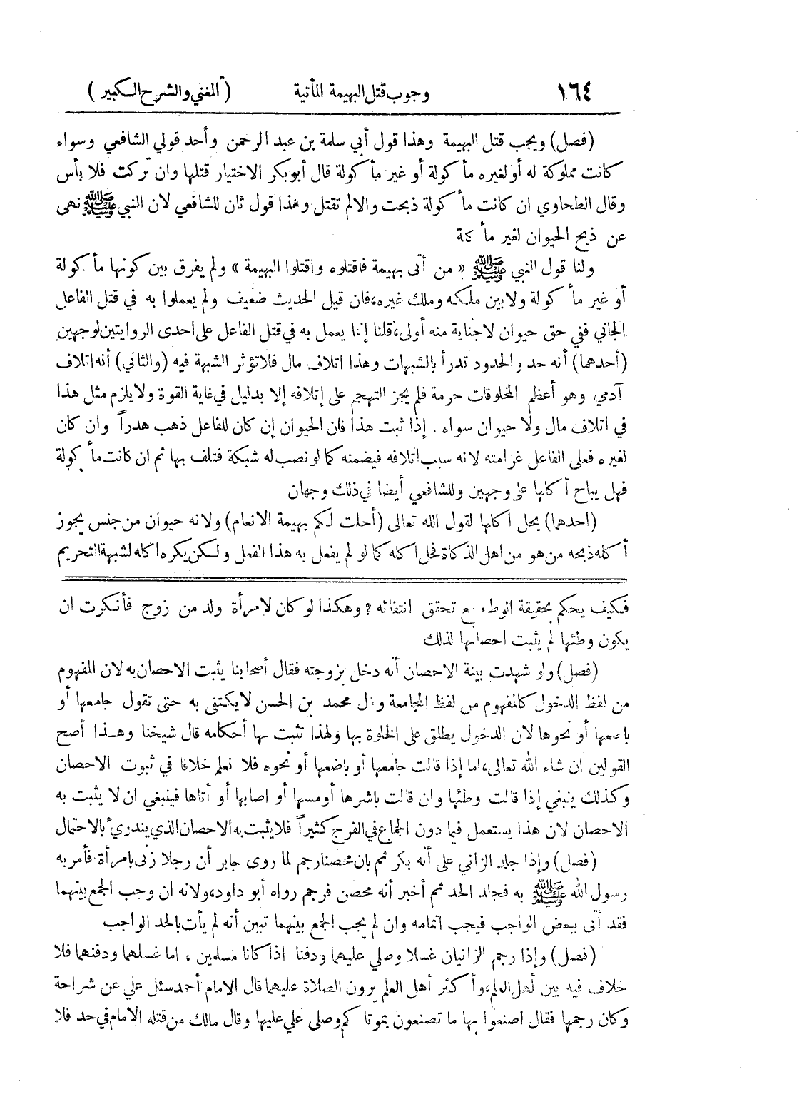 فكيف يحكم بحقيقة الوطئ مع تحقق انتفائه؟ وهكذا لو كان لامرأة ولد من زوج فأنكرت أن يكون وطئها لم يثبت إحصانها لذلك (فصل) ولو شهدت بينة الاحصان أنه دخل بزوجته فقال أصحابنا يثبت الاحصان به لأن المفهوم من لفظ الدخول كالمفهوم من لفظ المجامعة (وقول) محمد بن الحسن لا يكتفى به حتى تقول جامعها أو باضعها أو نحوها لأن الدخول يطلق على الخلوة بها ولهذا تثبت بها أحكامه قال شيخنا وهذا أصح القولين إن شاء الله تعالى، أما إذا قالت جامعها أو باضعها أو نحوه فلا نعلم خلافاً في ثبوت الاحصان وكذلك ينبغي إذا قالت وطئها وان قالت باشرها أو مسها أو أصابها أو أتاها فينبغي أن لا يثبت به الاحصان لأن هذا يستعمل فيما دون الجماع في الفرج كثيراً فلا يثبت به الإحصان الذي يندرئ بالاحتمال (فصل) وإذا جلد الزاني على أنه بكر ثم بان محصناً رجم لما روى جابر أن رجلا زنى بامرأة فأمر به رسول الله صلى الله عليه وسلم به فجلد الحد ثم أخبر أنه محصن فرجم رواه أبو داود، ولأنه إن وجب الجمع بينهما فقد أتى ببعض الواجب فيجب إتمامه وإن لم يجب الجمع بينهما تبين أنه لم يأت بالحد الواجب (فصل) وإذا رجم الزانيان غسلا وصلي عليهما ودفنا إذا كانا مسلمين، أما غسلهما ودفنهما فلا خلاف فيه بين أهل العلم، وأكثر أهل العلم يرون الصلاة عليهما قال الامام أحمد سئل علي عن شراحة وكان رجمها فقال اصنعوا بها ما تصنعون بموتاكم وصلى علي عليها وقال مالك من قتله الامام في حد فلا