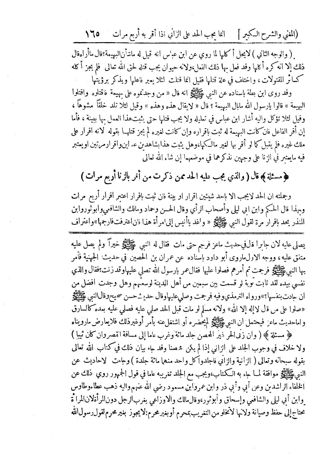 (صلوا على من قال لا إله إلا الله) ولأنه مسلم لو مات قبل الحد صلي عليه فصلي عليه بعده كالسارق وأما حديث ماعز فيحتمل أن النبي صلى الله عليه وسلم لم يحضره أو اشتغل عنه بأمر أو غير ذلك فلا يعارض مارويناه (مسألة) (وإن زنى الحر غير المحصن جلد مائة وغرب عاما إلى مسافة القصر وان كان ثيبا) ولا خلاف في وجوب الجلد على الزاني إذا لم يكن محصناً وقد جاء بيان ذلك في كتاب الله تعالى بقوله سبحانه وتعالى (الزانية والزاني فاجلدوا كل واحد منهما مائة جلدة) وجاءت لاحاديث عن النبي صلى الله عليه وسلم موافقة لما جاء به الكتاب، ويجب مع الجلد تغريبه عاما في قول الجمهور روى ذلك عن الخلفاء الراشدين وعن أبي وأبي ذر وابن عمر وابن مسعود رضي الله عنهم وإليه ذهب عطاء وطاوس وابن أبي ليلى والشافعي واسحاق وأبو ثور، وقال مالك والاوزاعي يغرب الرجل دون المرأة لأن المرأة تحتاج إلى حفظ وصيانة ولأنها لا تخلو من التغريب بمحرم أو بغير محرم: لا يجوز بغير محرم لقول رسول الله
