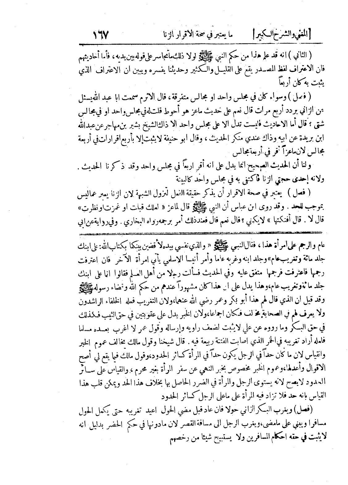 عام والرجم على امرأة هذا، فقال النبي صلى الله عليه وسلم (والذي نفسي بيده لأقضين بينكما بكتاب الله: على ابنك جلد مائة وتغريب عام) وجلد ابنه وغربه عاماً وأمر أنيسا الاسلمي يأتي امرأة الآخر فان اعترفت رجمها فاعترفت فرجمها متفق عليه وفي الحديث فسألت رجالا من أهل العلم فقالوا إنما على ابنك جلد مائة وتغريب عام، وهذا يدل على أن هذا كان مشهوراً عندهم من حكم الله وقضاء رسوله صلى الله عليه وسلم وقد قيل إن الذي قال لهم هذا أبو بكر وعمر رضي الله عنهما، ولأن التغريب فعله الخلفاء الراشدون ولا يعرف لهم في الصحابة مخالف فكان أجماعاً، ولأن الخبر يدل على عقوبتين في حق الثيب فكذلك في حق البكر وما رووه عن علي لا يثبت لضعف روايه وإرساله وقول عمر لا أغرب بعده مسلماً فلعله أراد تغريبه في الخمر الذي أصابت الفتنة ربيعة فيه.