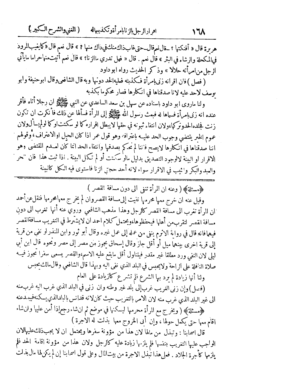 (مسألة) (وعنه أن المرأة تنفى إلى دون مسافة القصر) وقيل عنه إن خرج معها محرمها نفيت إلى مسافة القصر وإن لم يخرج معها محرمها فنقل عن أحمد أن المرأة تغرب إلى مسافة القصر كالرجل وهذا مذهب الشافعي وروي عنه أنها تغرب الى دون