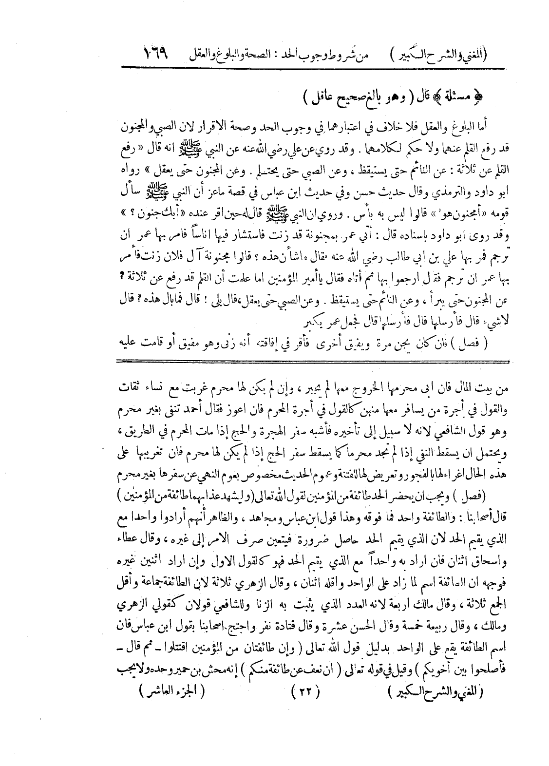 من بيت المال فان أبى محرمها الخروج معها لم يجبر، وإن لم يكن لها محرم غربت مع نساء ثقات والقول في أجرة من يسافر معها منهن كالقول في أجرة المحرم فان اعوز فقال أحمد تنفى بغير محرم وهو قول الشافعي لأنه لا سبيل إلى تأخيره فأشبه سفر الهجرة والحج إذا مات المحرم في الطريق، ويحتمل أن يسقط النفي إذا لم تجد محرما كما يسقط سفر الحج إذا لم يكن لها محرم فان تغريبها على هذه الحال إغراء لها بالفجور وتعريض لها للفتنة وعموم الحديث مخصوص بعوم النهي عن سفرها بغير محرم (فصل) ويجب أن يحضر الحد طائفة من المؤمنين لقول الله تعالى (وليشهد عذابهما طائفة من المؤمنين) قال اصحابنا: والطائفة واحد فما فوقه وهذا قول ابن عباس ومجاهد، والظاهر أنهم أرادوا واحدا مع الذي يقيم الحد لأن الذي يقيم الحد حاصل ضرورة فيتعين صرف الأمر إلى غيره، وقال عطاء