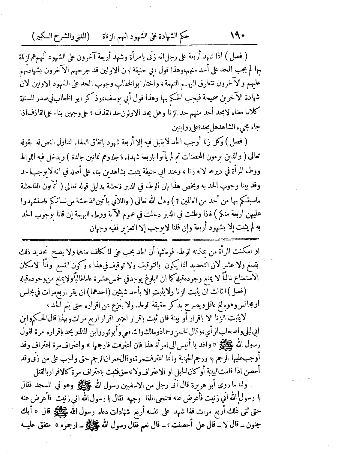 أو أمكنت المرأة من يمكنه الوطئ فوطئها أن الحد يجب على المكلف منهما ولا يصح تحديد ذلك بتسع ولا عشر لأن التحديد إنما يكون بالتوقيف ولا توقيف في هذا، وكون التسع وقتاً لامكان الاستمتاع غالبا لايمنع وجوده قبله كما أن البلوغ يوجد في خمس عشرة عاماً غالباً ولا يمنع من وجوده قبله (فصل) الثالث أن يثبت الزنا ولا يثبت إلا بأحد شيئين (أحدهما) أن يقر اربع مرات في مجلس او مجالس وهو بالغ عاقل ويصرح بذكر حقيقة الوطئ ولا ينزع عن اقراره حتى يتم الحد، لا يثبت الزنا الا باقرار أو بينة فإن ثبت باقرار اعتبر إقرار اربع مرات وبهذا قال الحكم وابن أبي ليلى وأصحاب الرأي، وقال الحسن وحماد ومالك والشافعي وأبو ثور وابن المنذر يحد باقراره مرة لقول رسول الله صلى الله عليه وسلم (واغد يا أنيس الى امرأة هذا فان اعترفت فارجمها) واعتراف مرة اعتراف وقد أوجب عليها الرجم به ورجم الجهنية وإنما اعترفت مرة، وقال عمران الرجم حق واجب على من زنى وقد احصن اذا قامت البينة أو كان الحبل أو الاعتراف ولأنه حق فثبت باعتراف مرة كالاقرار بالقتل ولنا ما روى أبو هريرة قال أتى رجل من الاسلميين رسول الله صلى الله عليه وسلم وهو في المسجد فقال يا رسول الله إني زنيت فأعرض عنه فتنحى تلقاء وجهه فقال يا رسول الله إني زنيت فأعرض عنه حتى ثنى ذلك أربع مرات فلما شهد على نفسه أربع شهادات دعاه رسول الله صلى الله عليه وسلم قال (أبك جنون - قال لا - قال هل أحصنت؟ - قال نعم فقال رسول الله صلى الله عليه وسلم - ارجموه) متفق عليه